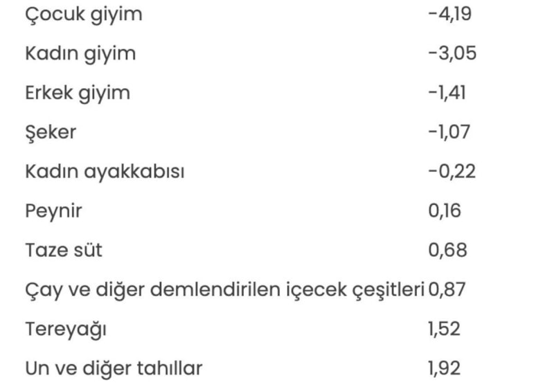 Geçen ay en fazla fiyat düşüşü ise yüzde 4,19 ile çocuk giyimde oldu. Bunu, yüzde 3,05 ile kadın giyim, yüzde 1,41 ile erkek giyim, yüzde 1,07 ile şeker, yüzde 0,22 ile kadın ayakkabısı takip etti.