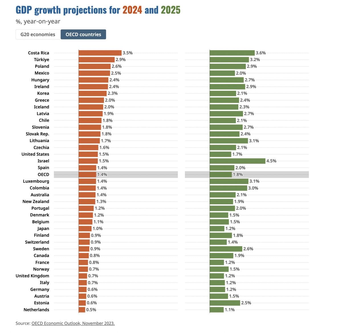 OECD bugün yayımladığı Ekonomik Görünüm raporunda Türkiye ekonomisi için 2024'teki büyüme tahminini 2,6'dan yüzde 2,9'a yükseltirken, küresel ekonomi için 2024 büyüme tahminini de yüzde 2,7'de sabit tuttu.