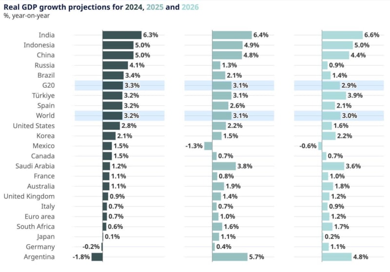 Küresel GSYİH büyümesinin 2024'te yüzde 3,2'den 2025'te yüzde 3,1'e ve 2026'da yüzde 3'e düşmesi, çeşitli G20 ekonomilerindeki daha yüksek ticaret engelleri ve artan politika belirsizliğinin yatırım ve hanehalkı harcamalarını etkilemesi bekleniyor.