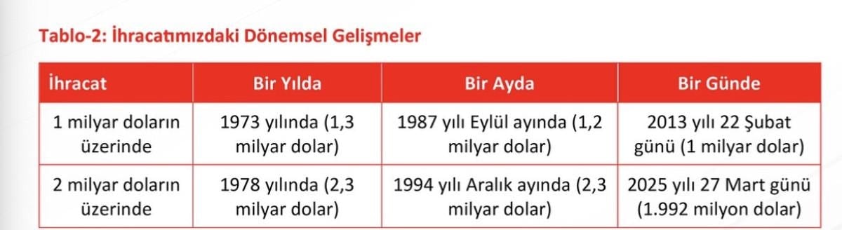 1973 yılında, bir yılda 1 milyar dolar ihracat yapılabilirken, 1987'de bu başarı bir ayda, 2013'ten itibaren ise bir günde gerçekleştirilebilir hale gelmiştir. Bugün ise günlük ihracatımız zaman zaman 2 milyar dolara ulaşmaktadır.