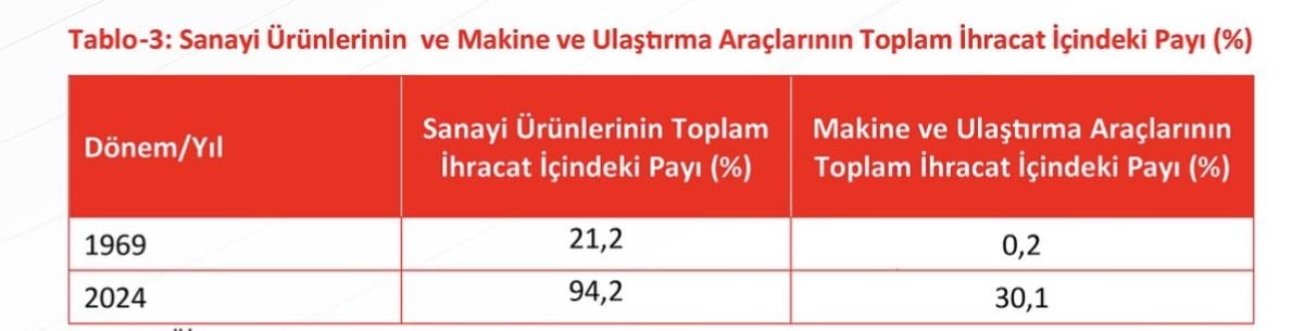 1969 yılında sanayi ürünleri ihracatının toplam ihracat içindeki payı yüzde 21,2 iken, 2024 yılı itibarıyla bu oran yüzde 94,2'ye yükselmiştir. Aynı şekilde, 1969 yılında makine ve ulaştırma araçlarının toplam ihracat içindeki payı yalnızca yüzde 0,2 düzeyindeyken, 2024 yılında bu oran yüzde 30,1'e ulaşmıştır.
