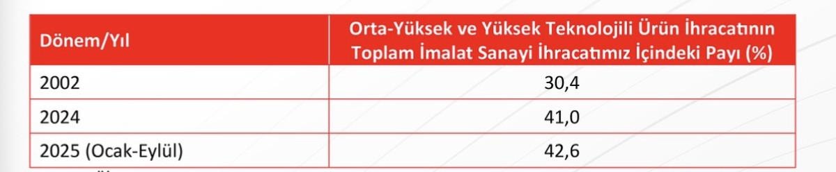 Bu gayretlerimizin bir sonucu olarak, 2002 yılında yüzde 30,4 olan orta-yüksek ve yüksek teknolojili ürün ihracatının toplam imalat sanayi ihracatımız içindeki payı, 2024 yılında yüzde 41'e, 2025 yılının ilk 9 ayında ise yüzde 42,6'ya yükselmiştir. Son 22 yılda sağlanan bu büyük başarıyla orta yüksek ve yüksek teknolojili ürün ihracatımızda artış aralıksız devam etmektedir.