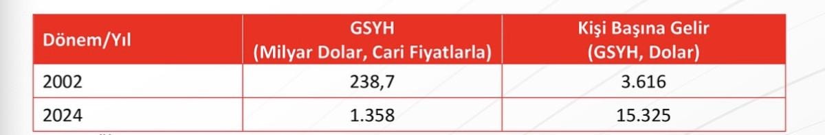 2002-2024 döneminde Gayri Safi Yurt İçi Hasıla reel olarak yüzde 216 oranında artmış, dolar bazında yaklaşık beş kat büyümüştür.