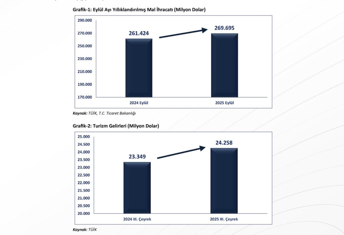 AB-27'nin yıllıklandırılmış ithalatının hala yatay seyrini koruması, zayıf dış talep, yakın coğrafyamızda süregelen savaşlar, tarife artışlarının getirdiği belirsizliğin devam etmesiyle gelen zorlu rekabet şartlarına rağmen hem mal hem de hizmet ihracatımızda artış devam etmektedir.