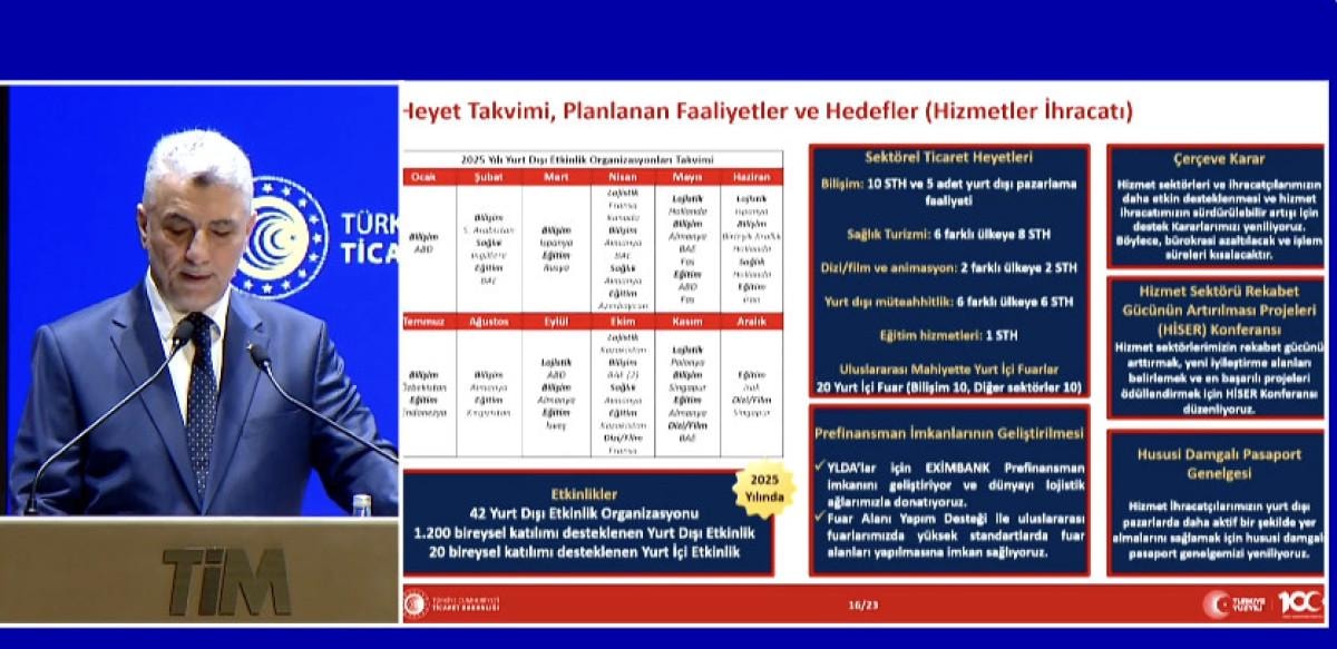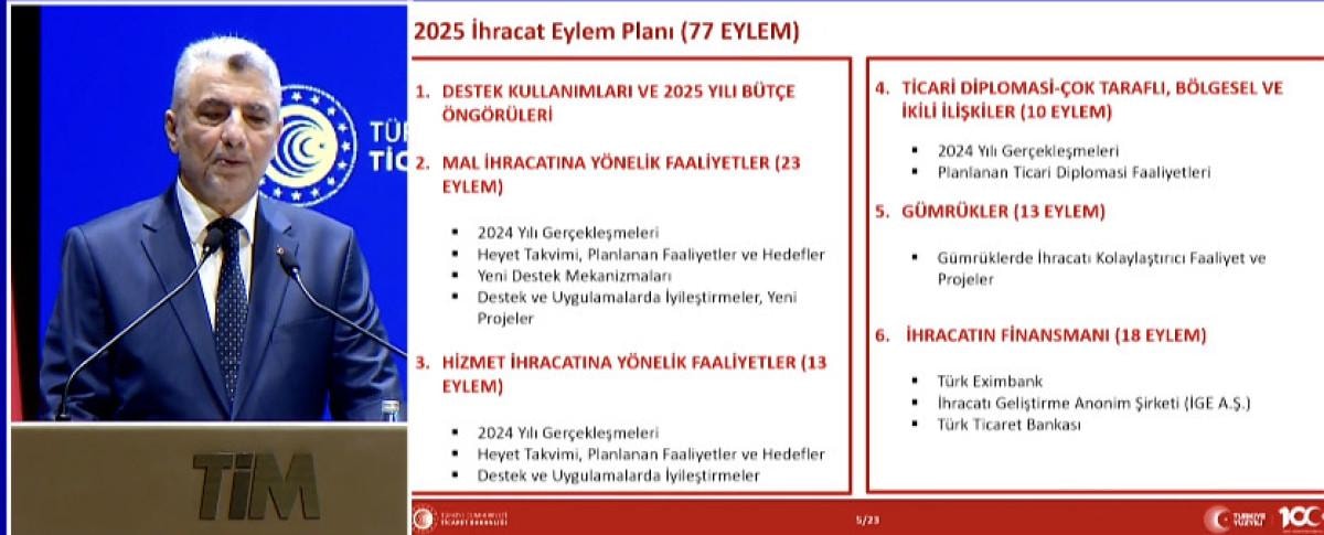Bakan Bolat, 2025 için mal ve hizmet ihracatını artıracak destekleri kapsayan 77 eylem maddesinden oluşan eylem planını açıklayarak, bu kapsamda ihracatçılara verilen destek ve destek mekanizmalarını içeren yeni projeler yürütüleceğini belirtti.