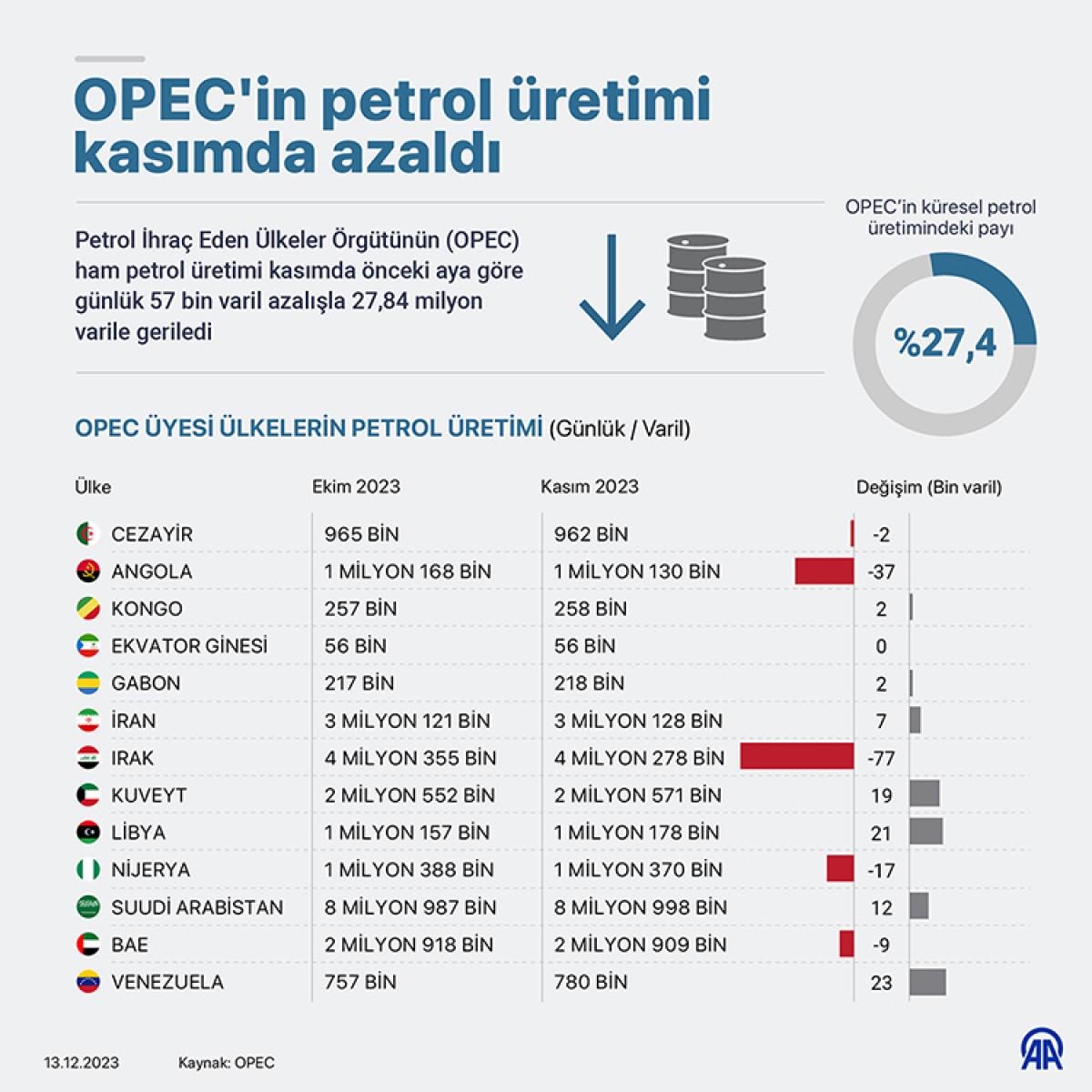 Kasımda OPEC'in ham petrol üretiminin küresel üretimdeki payı ise yüzde 27,4 olarak kayıtlara geçti.