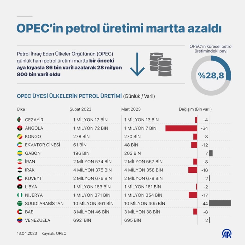 Grubun günlük ham petrol üretimi ise martta bir önceki aya kıyasla 86 bin varil azalarak yaklaşık 28 milyon 800 bin varil oldu. Böylece, OPEC'in küresel petrol üretimindeki payı yüzde 28,8 olarak kayıtlara geçti.