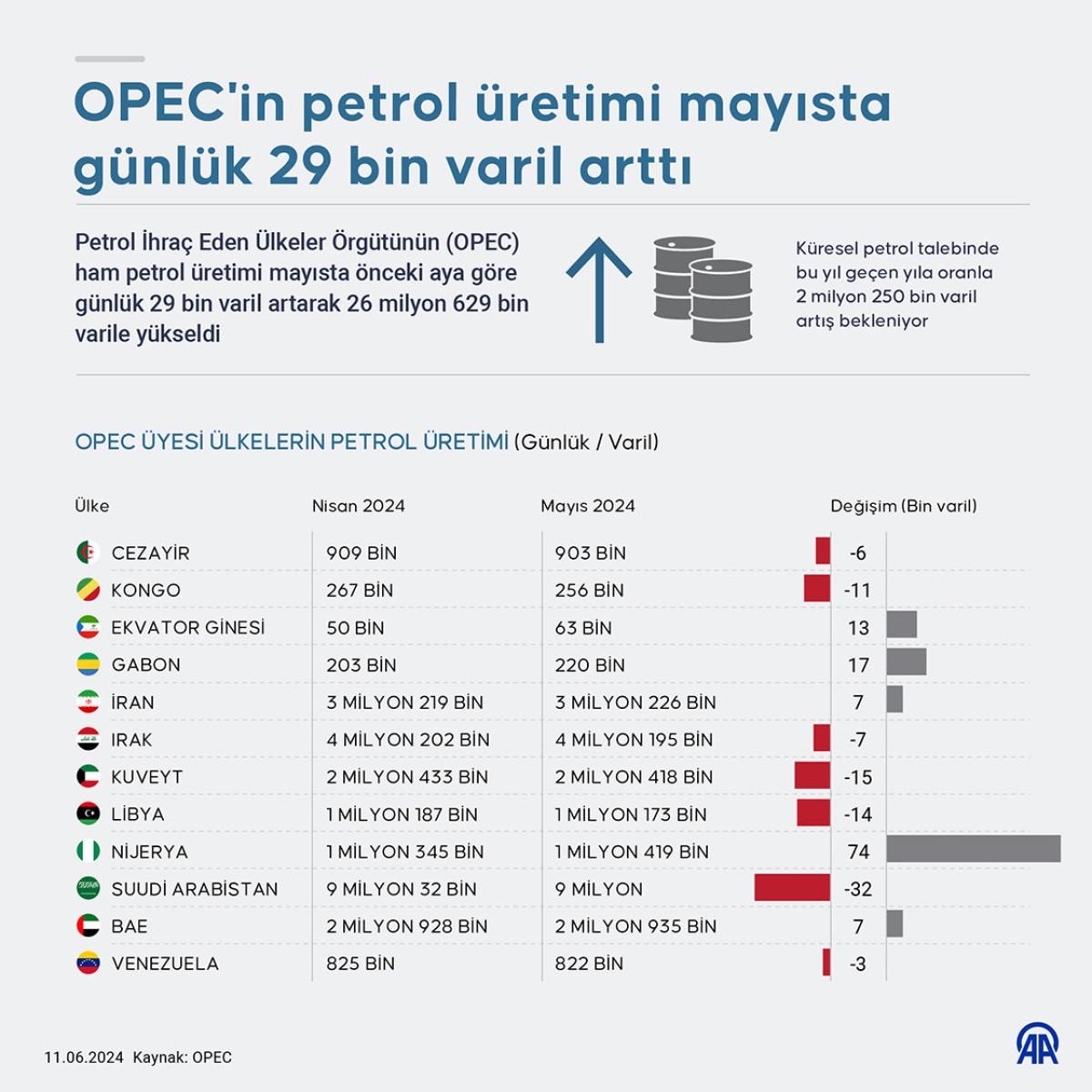 Aynı dönemde, grubun en büyük üreticisi Suudi Arabistan'da günlük üretim 32 bin varil azalırken, Kuveyt'te 15 bin varil, Libya'da 14 bin varil, Kongo'da 11 bin varil düşüş gösterdi.