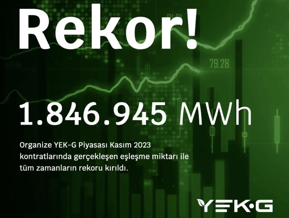 Organize YEK-G Piyasası Kasım 2023 kontratlarında, 1 milyon 846 bin 945 megavatsaat eşleşme miktarı ile tüm zamanların rekoru kırıldı.