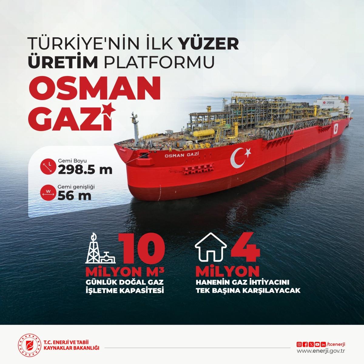 Enerji ve Tabii Kaynaklar Bakanlığından yapılan yazılı açıklamada, Türkiye'nin ilk Yüzer Üretim Tesisi (FPU) Osman Gazi'nin 298,5 metre uzunluğa, 56 metre genişliğe ve 29,5 metre derinliğe sahip olduğu belirtildi.