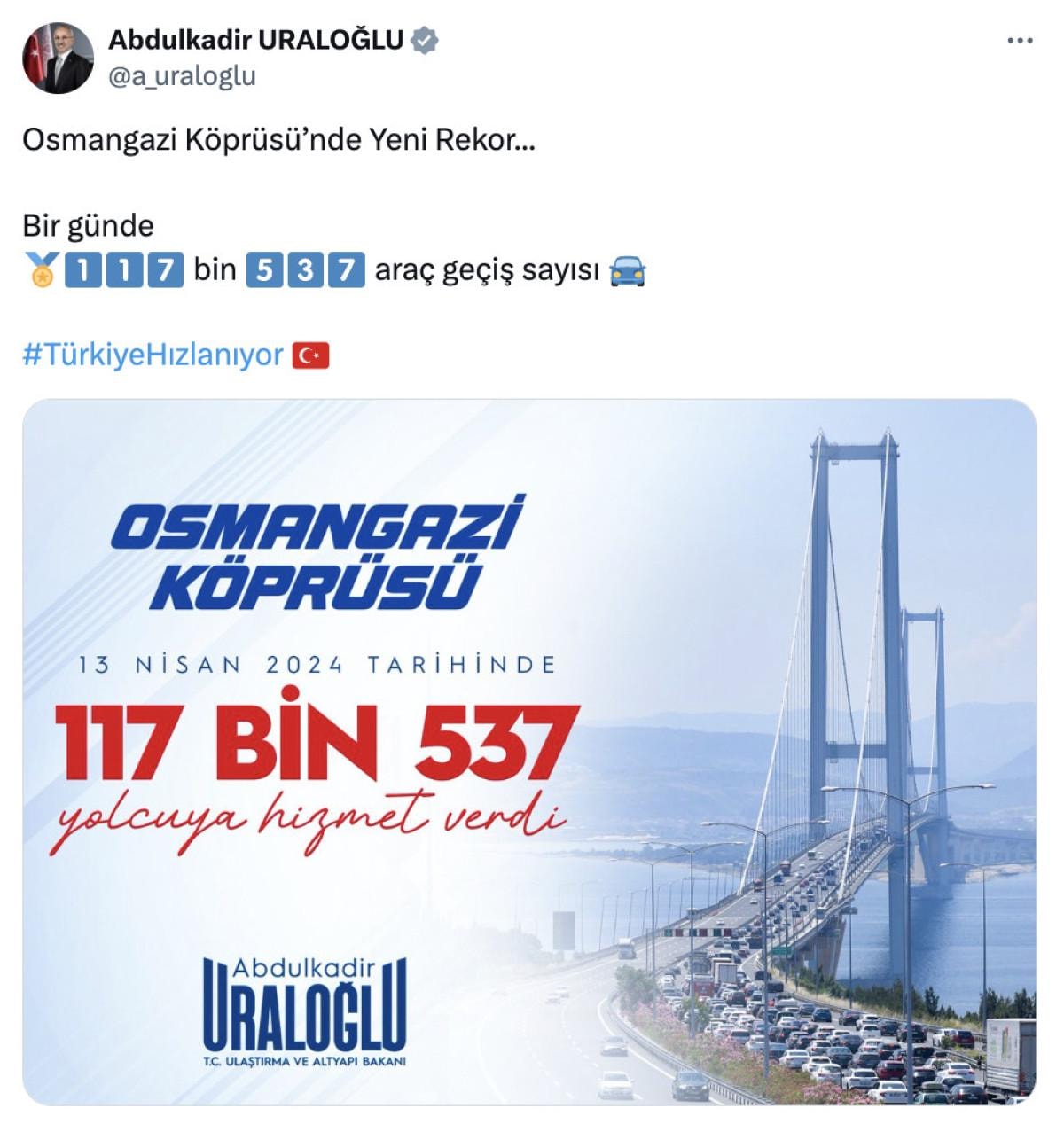 Bu aşamada Ulaştırma ve Altyapı Bakanı Abdulkadir Uraloğlu, sosyal medya hesabı üzerinden 13 Nisan günü Osmangazi Köprüsü’nden günlük geçiş rekorunun kırıldığını açıkladı.