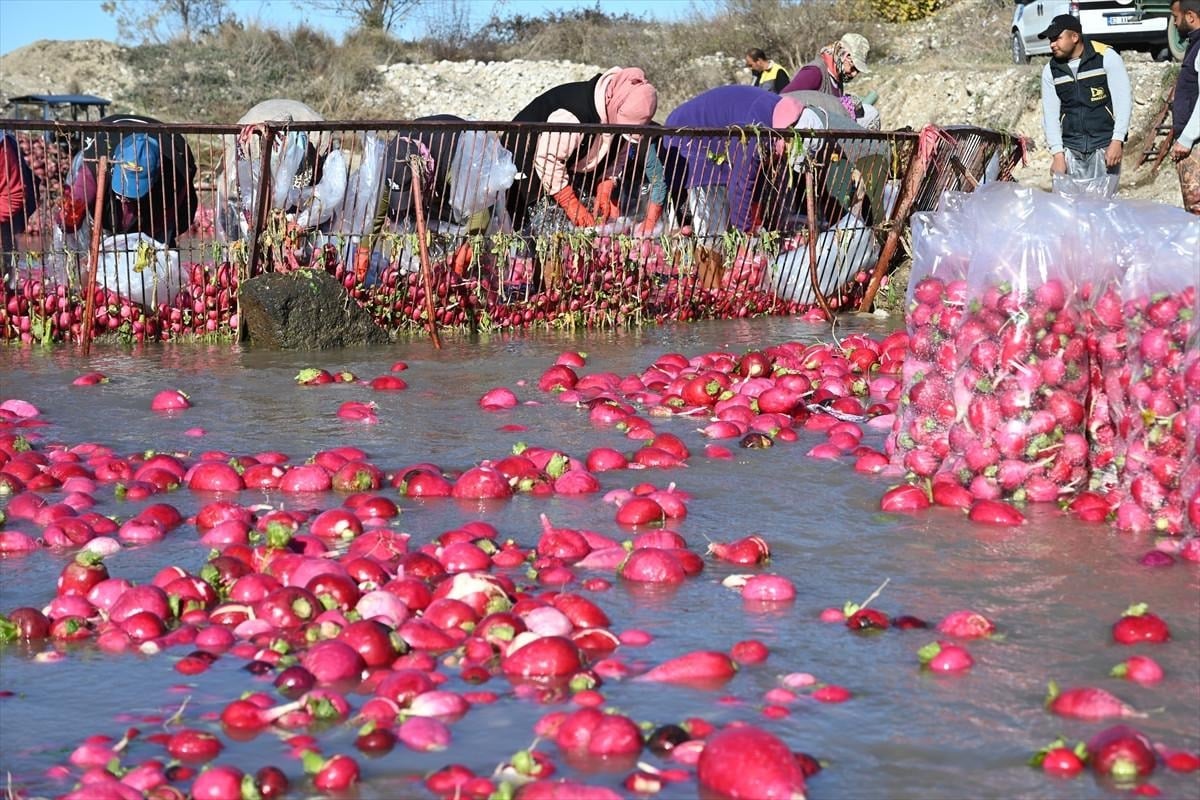 Tarım işçilerince tarlalardan toplanan turplar, Savrun Çayı'nda yıkanıp toprağından arındırılıyor.