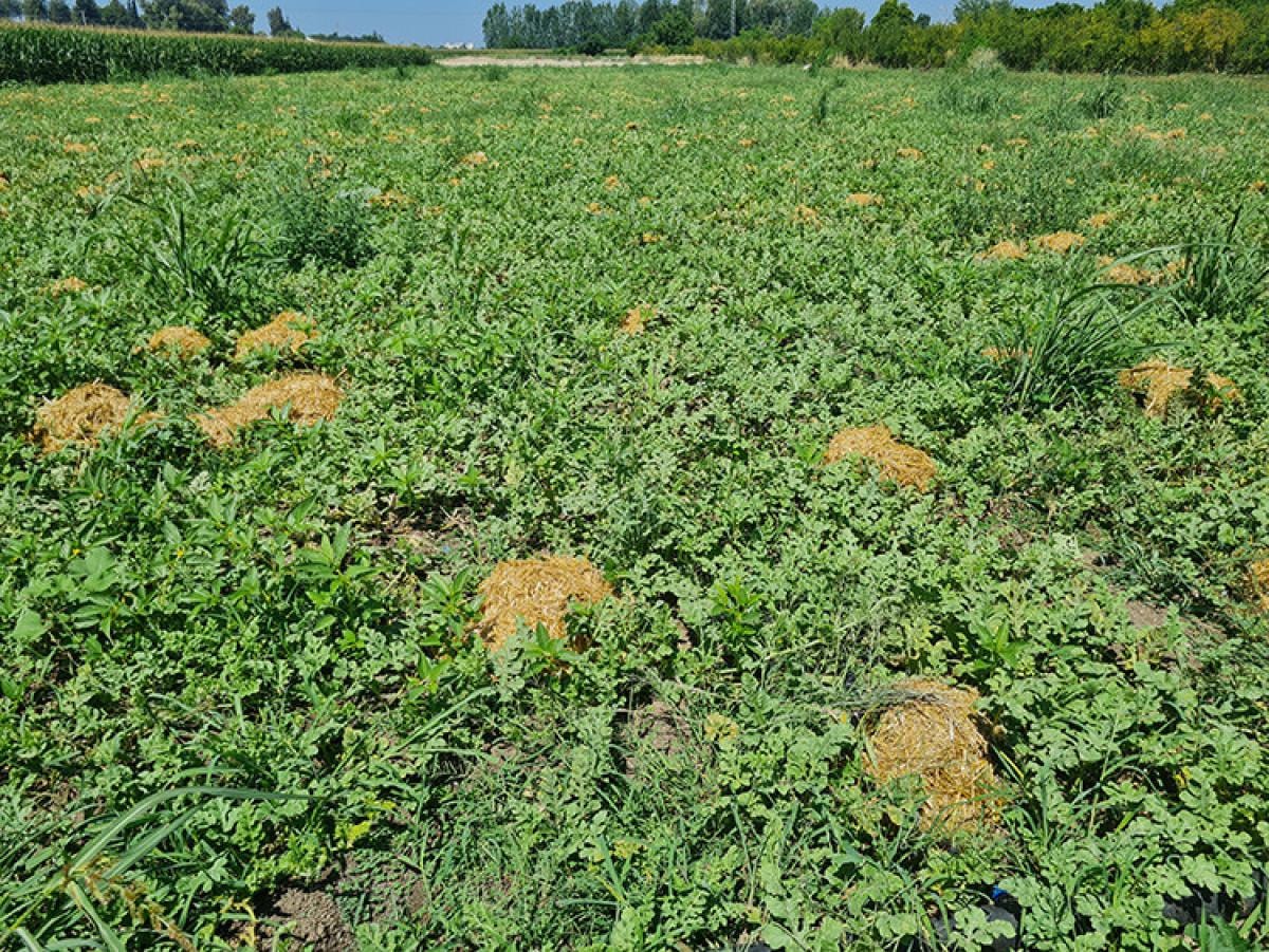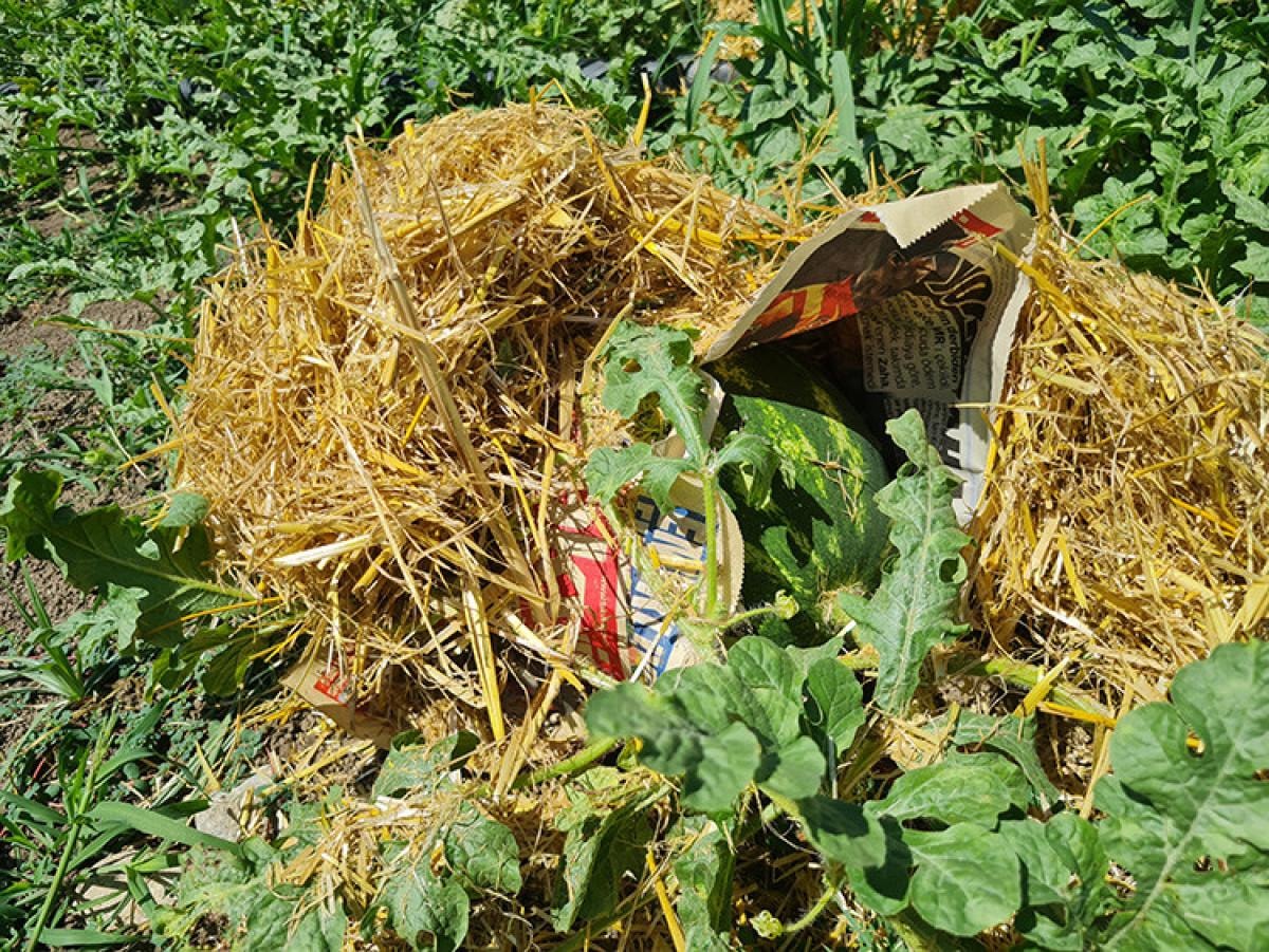 Osmaniye'de karpuz üreticileri, ürünlerini gazeteye sarıp, üzerini samanla örterek aşırı sıcağın etkisinden korumaya çalışıyor.