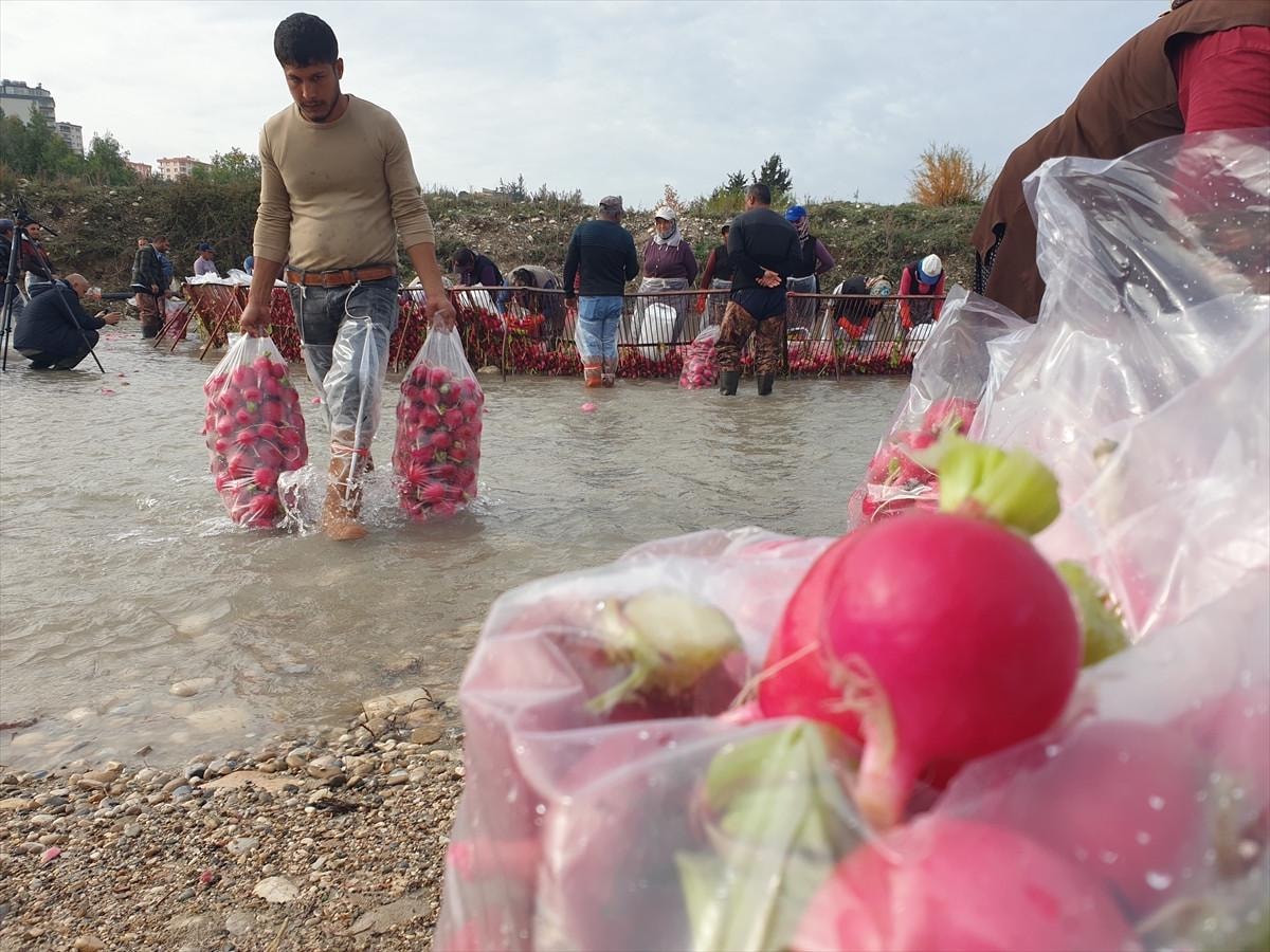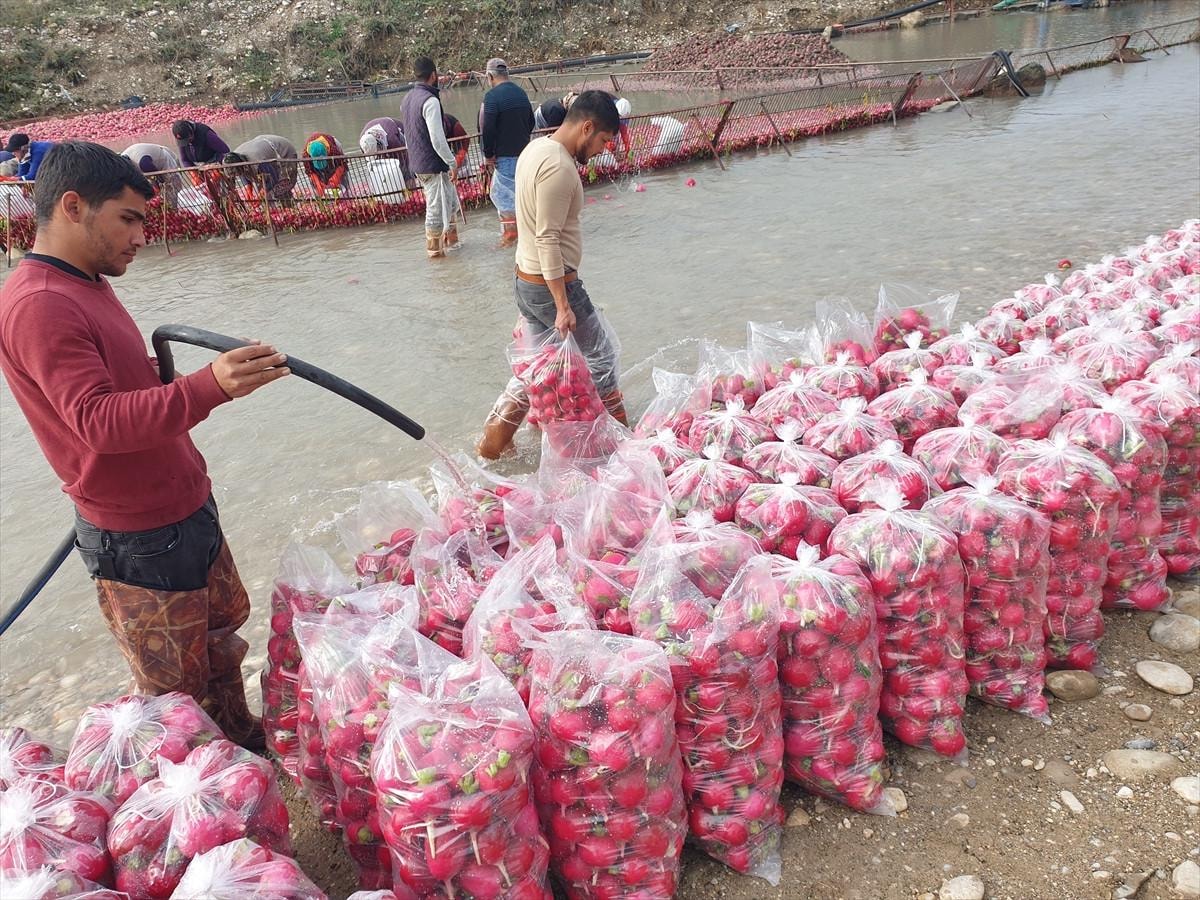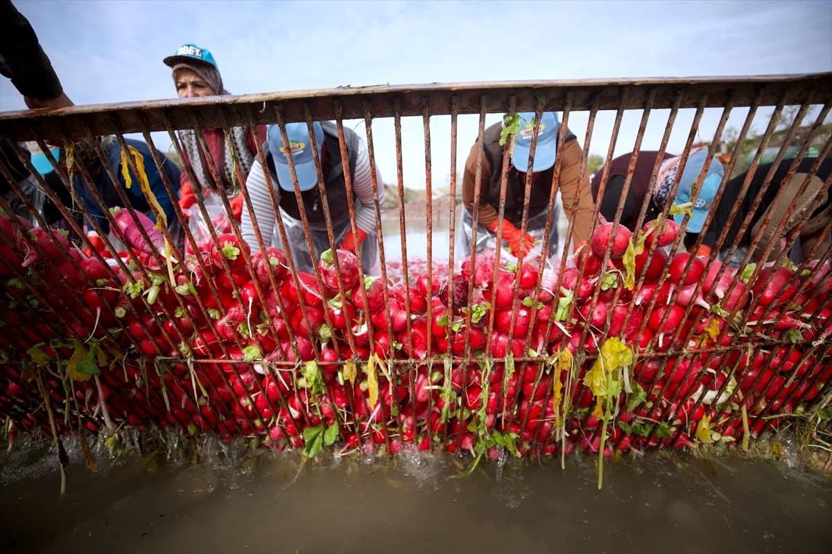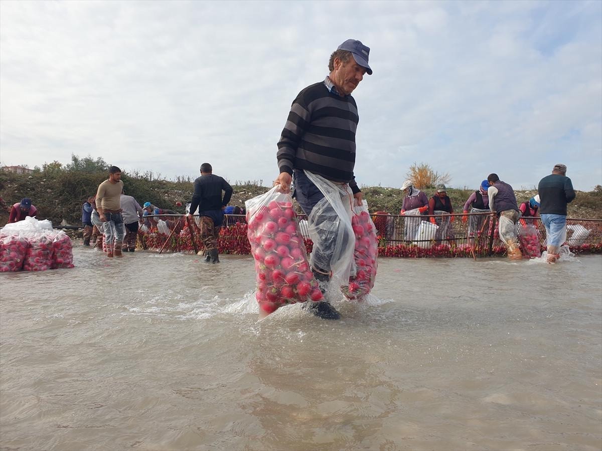 İlçedeki yaklaşık 40 bin dekar alanda üretilen kırmızı turplar, çoğunluğunu kadınların oluşturduğu işçiler tarafından toplanıp Savrun Çayı'na taşınıyor.