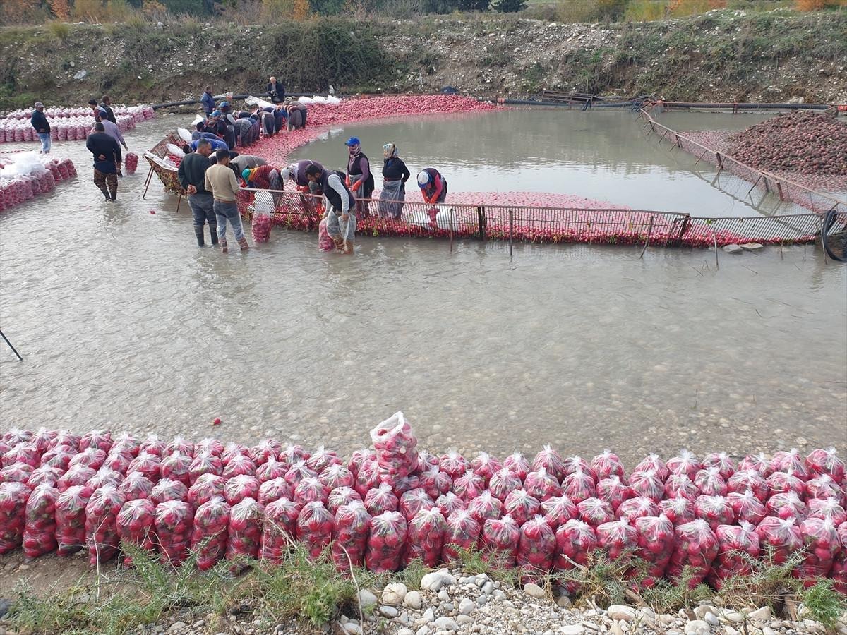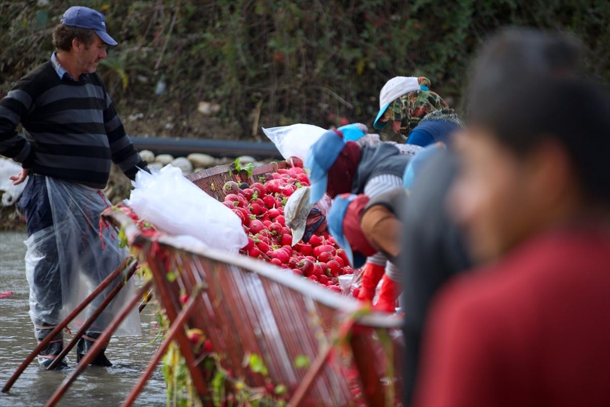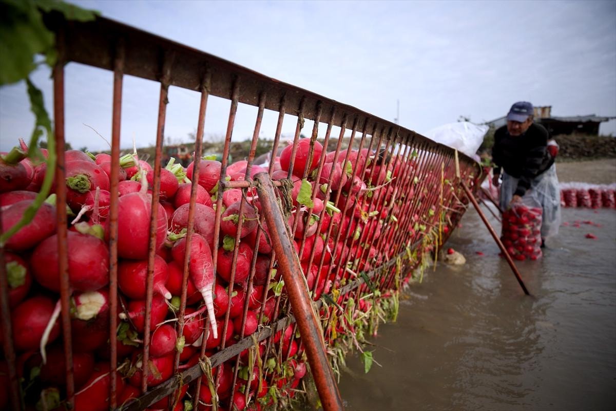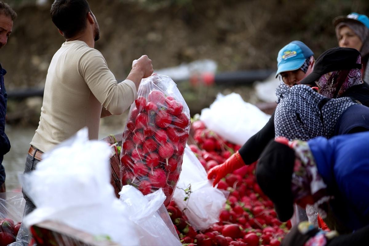 İlçedeki yaklaşık 40 bin dekar alanda üretilen kırmızı turplar, çoğunluğunu kadınların oluşturduğu işçiler tarafından toplanıp Savrun Çayı'na taşınıyor.
