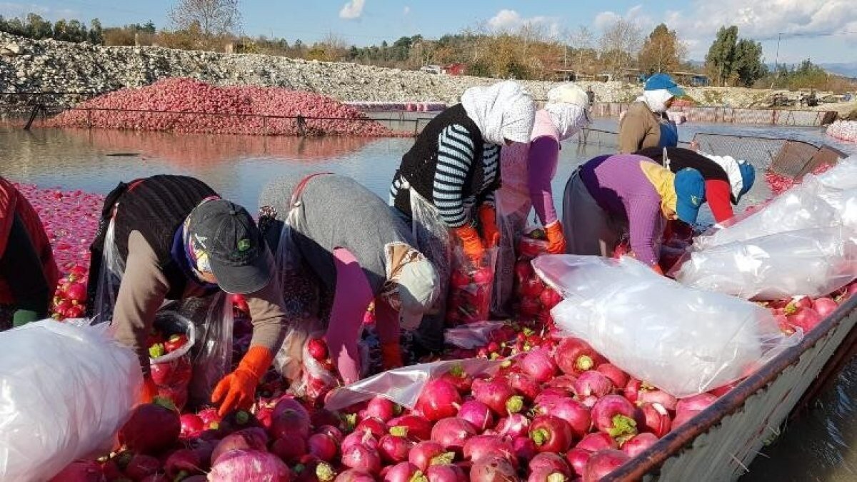 Savrun Çayı'nın yarım metreye varan soğuk suyunun içerisinde kadın işçiler, günlük 70 lira yevmiye için sabahın ilk ışıklarıyla turp yıkama ve paketleme işine başlıyor.