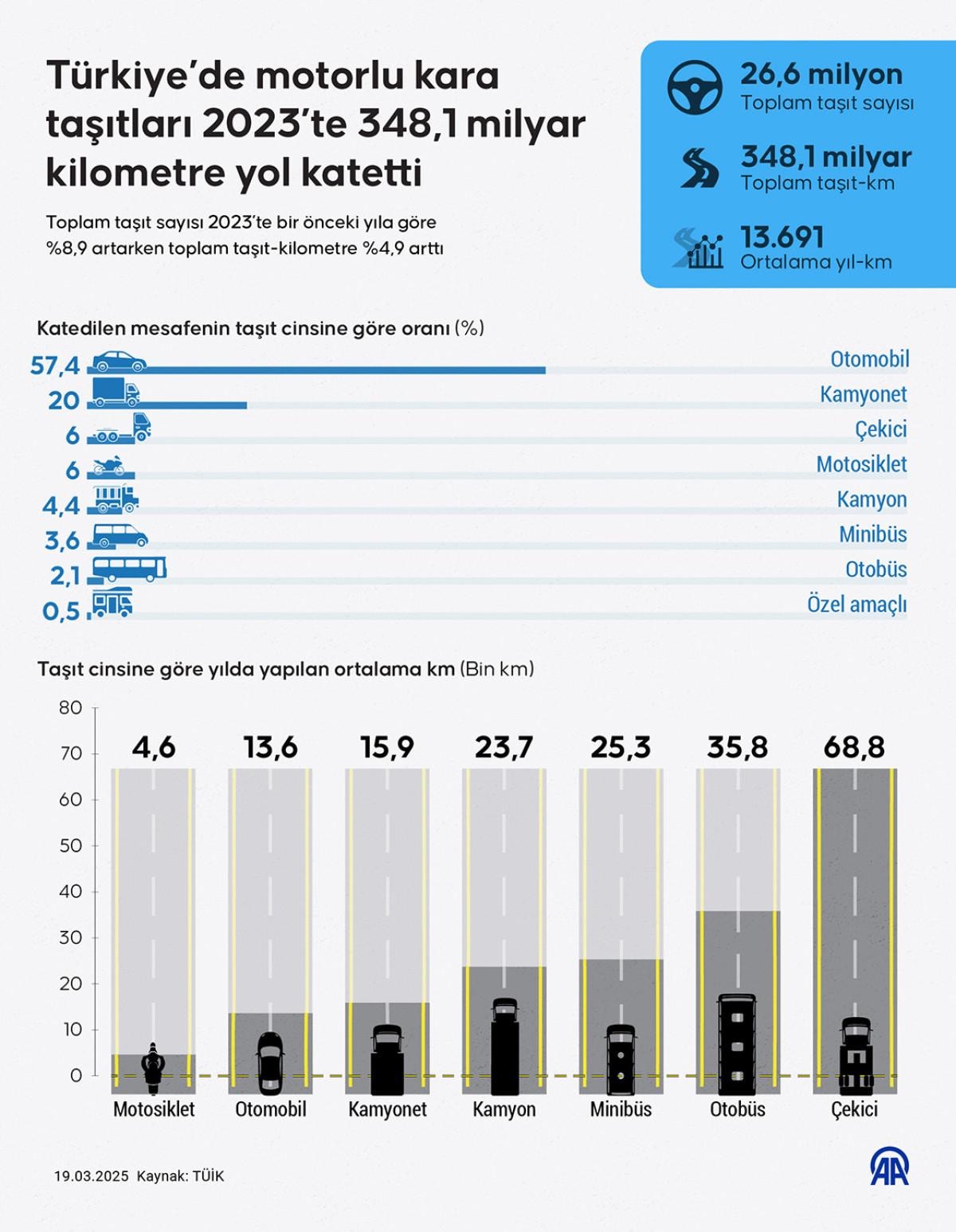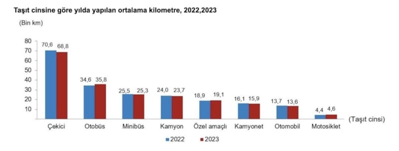 Taşıtların bir yılda yaptıkları ortalama kilometreler incelendiğinde; 2023 yılında sırasıyla çekicilerin 68 bin 785, otobüslerin 35 bin 808, minibüslerin 25 bin 268, kamyonların 23 bin 704, özel amaçlı taşıtların 19 bin 142, kamyonetlerin 15 bin 928, otomobillerin 13 bin 564 ve motosikletlerin 4 bin 554 kilometre yaptığı hesaplandı.