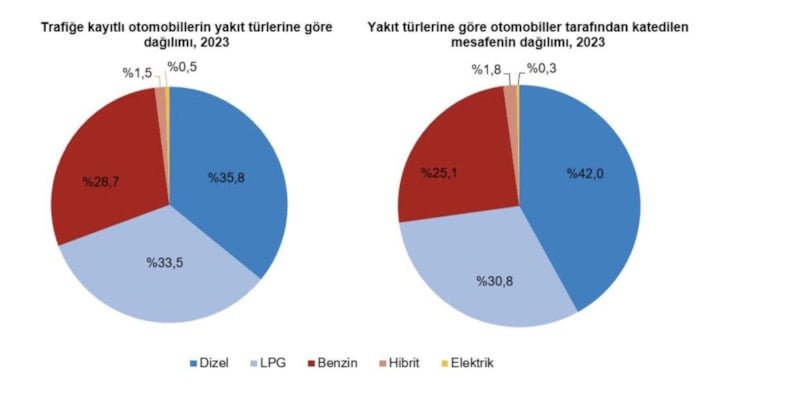 Otomobiller tarafından 2023 yılında katedilen mesafe taşıtların yakıt türlerine göre incelendiğinde; toplam taşıt-km'nin yüzde 42'si dizel, yüzde 30,8'i LPG'li, yüzde 25,1'i benzinli, yüzde 1,8'i hibrit ve yüzde 0,3'ü elektrikli otomobiller tarafından yapıldı.