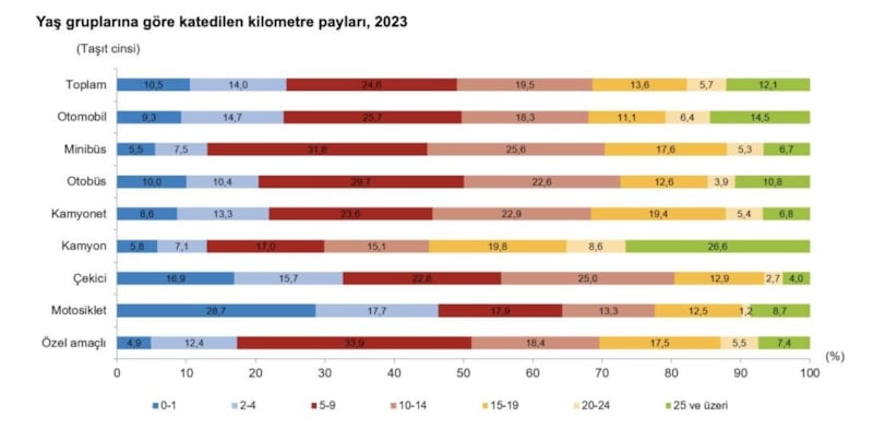 Türkiye'de 2023 yılında katedilen toplam mesafe taşıtların yaş gruplarına göre incelendiğinde; en fazla yol yüzde 24,6'lık oranla taşıt filosunun yüzde 19,8'ini oluşturan 5-9 yaş grubu taşıtlar tarafından yapılırken, bunu sırasıyla yüzde 19,5 ile 10-14 yaş, yüzde 14 ile 2-4 yaş, yüzde 13,6 ile 15-19 yaş, yüzde 12,1 ile 25 yaş ve üzeri, yüzde 10,5 ile 0-1 yaş ve yüzde 5,7 ile 20-24 yaş grubu taşıtlar takip etti. Bu oran otomobillerde 5-9 yaş otomobiller için yüzde 25,7, 10-14 yaş için yüzde 18,3, 2-4 yaş için yüzde 14,7, 25 yaş ve üzeri için yüzde 14,5, 14-19 yaş için yüzde 11,1, 0-1 yaş için yüzde 9,3 ve 20-24 yaş için ise yüzde 6,4 oldu.