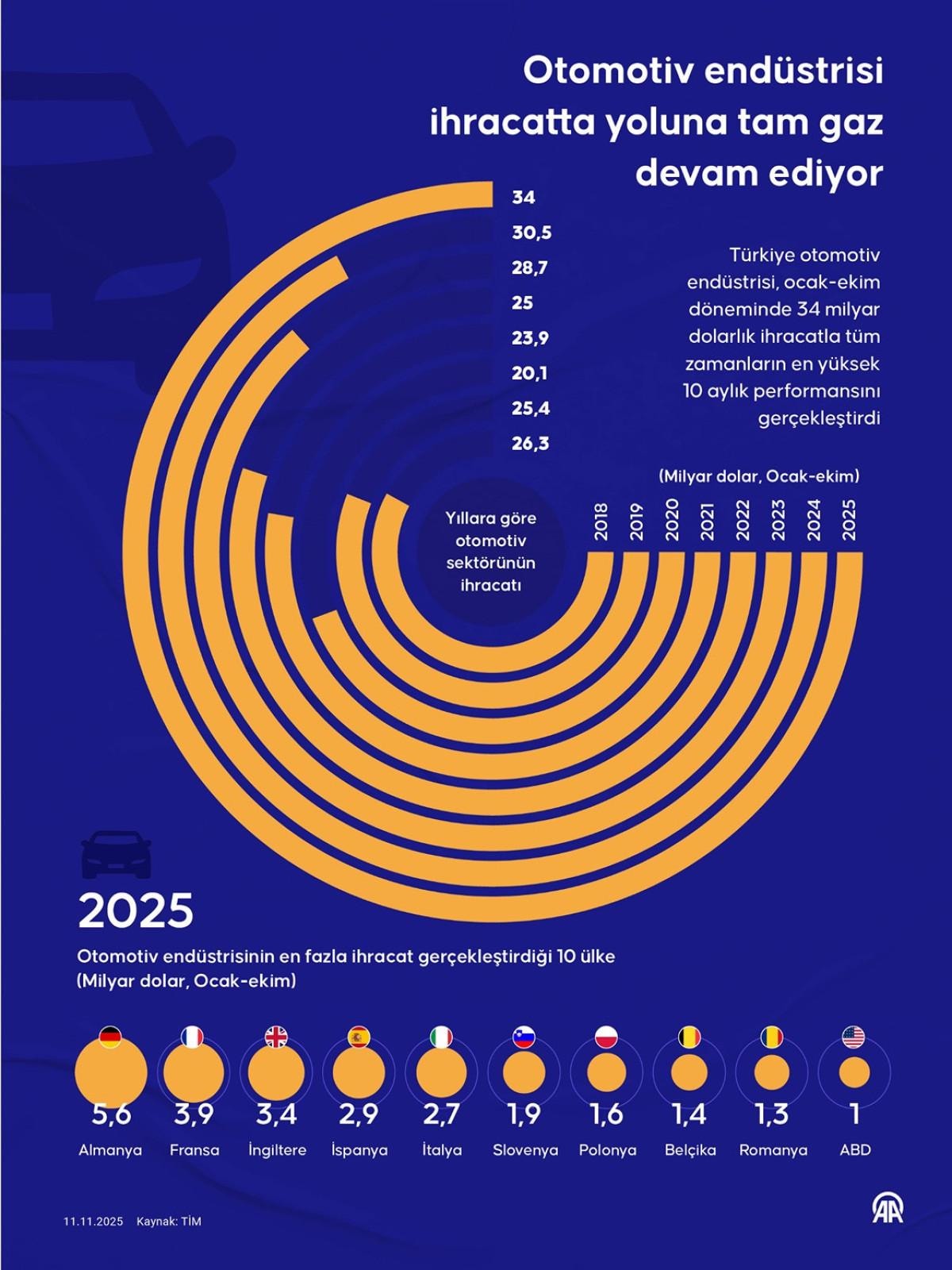- Türkiye otomotiv endüstrisi, yılın ilk 10 ayında 34 milyar dolarlık ihracatla tüm zamanların en yüksek ocak-ekim dönemi performansını sergiledi.