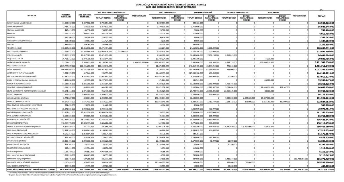 Buna göre, 2025 yılında kamu kurumları arasında en büyük bütçeyi toplam 6 trilyon 121 milyar 542 milyon 656 bin TL ile Hazine ve Maliye Bakanlığı aldı.