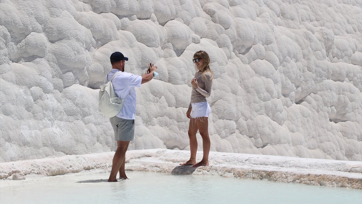 HES kodu sorgulamasının ardından ören yerine alınan ziyaretçiler, travertenler üzerinde yürüyüş yapıp fotoğraf çektirdi.