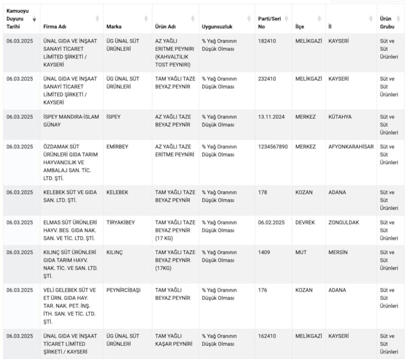 Az ve tam yağlı eritme peynirin, tam yağlı taze beyaz peyniri, kahvaltılık tost peyniri ve tam yağlı kayar peynirin yağ oranı düşük kaldı.