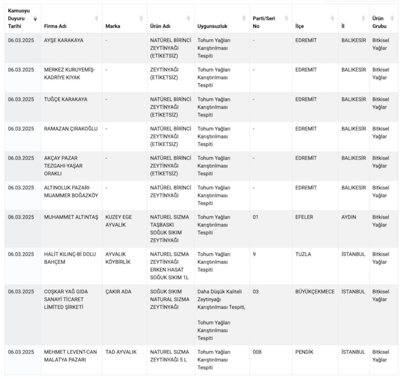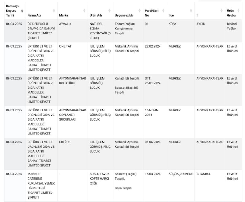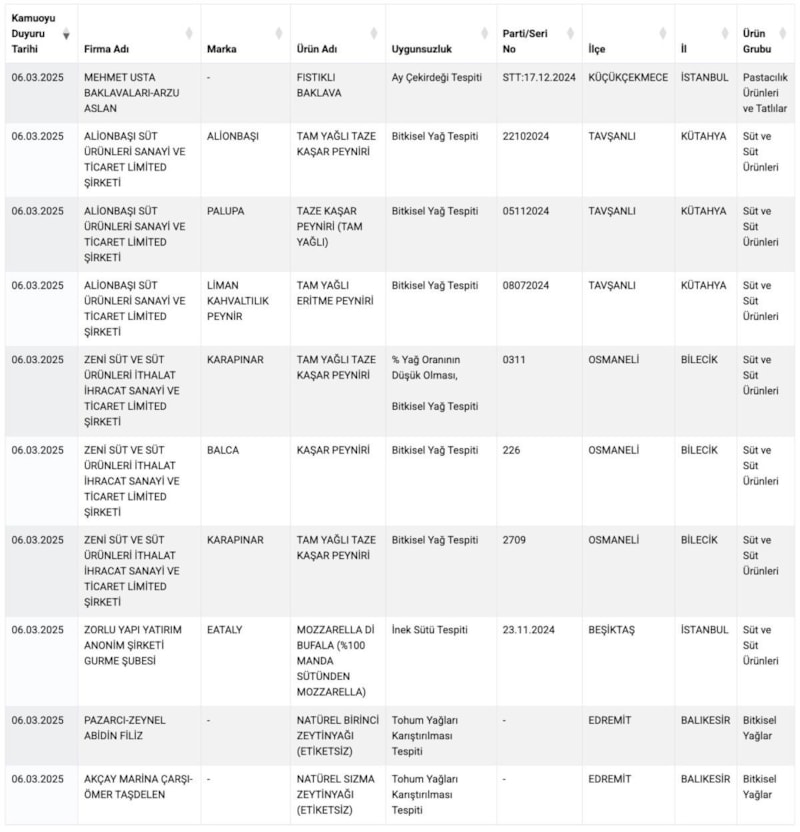 Bu kez Kayseri, Kütahya, Afyonkarahisar, Adana, Zonguldak, Mersin, İstanbul, Bilecik, Balıkesir, Aydın firmaları gıda ürünlerinde yaptıkları taklitlerle listede yer aldı.
