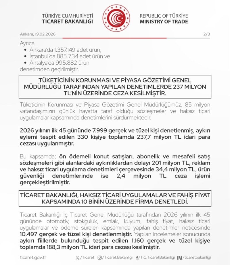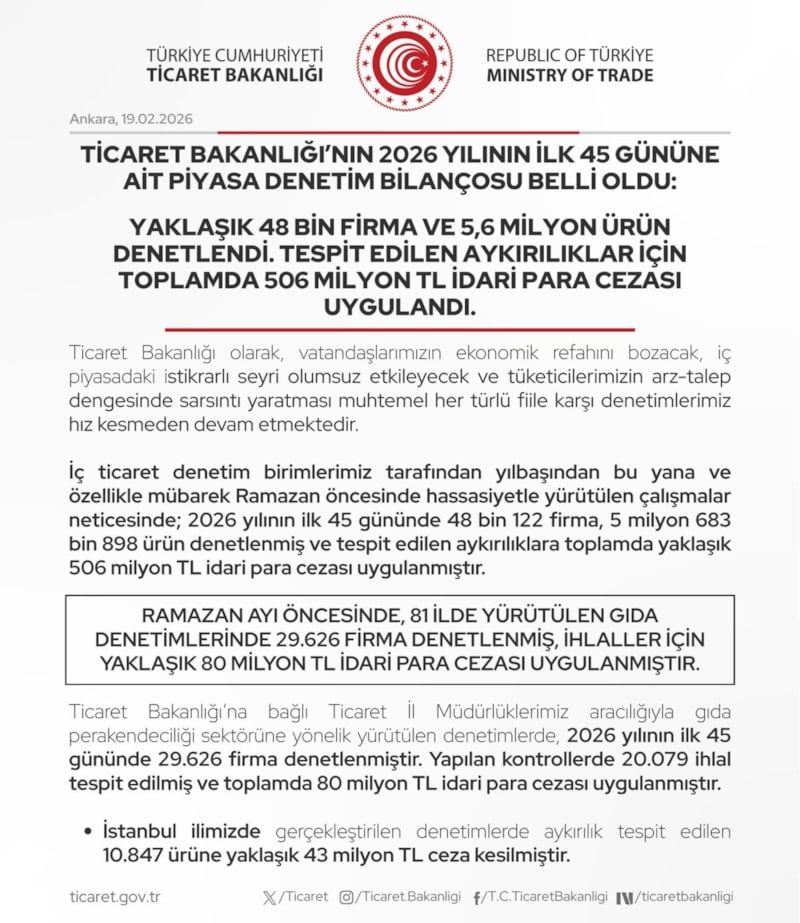 İç ticaret denetim birimlerimiz tarafından yılbaşından bu yana ve özellikle mübarek Ramazan öncesinde hassasiyetle yürütülen çalışmalar neticesinde; 2026 yılının ilk 45 gününde 48 bin 122 firma, 5 milyon 683 bin 898 ürün denetlenmiş ve tespit edilen aykırılıklara toplamda yaklaşık 506 milyon TL idari para cezası uygulanmıştır.