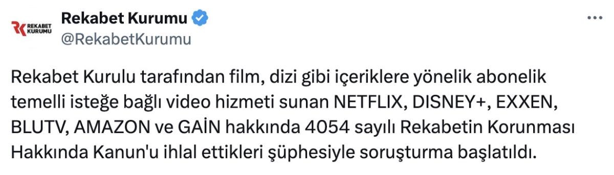 Rekabet Kurulu tarafından film, dizi gibi içeriklere yönelik abonelik temelli isteğe bağlı video hizmeti sunan NETFLIX, DISNEY+, EXXEN, BLUTV, AMAZON ve GAİN hakkında 4054 sayılı Rekabetin Korunması Hakkında Kanun'u ihlal ettikleri şüphesiyle soruşturma başlatıldı.