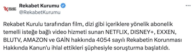 Rekabet Kurulu, abonelik temelli film ve dizi platformlarına açılan soruşturmaya sosyal medya hesabı üzerinden paylaştığı bir mesajla duyurdu.