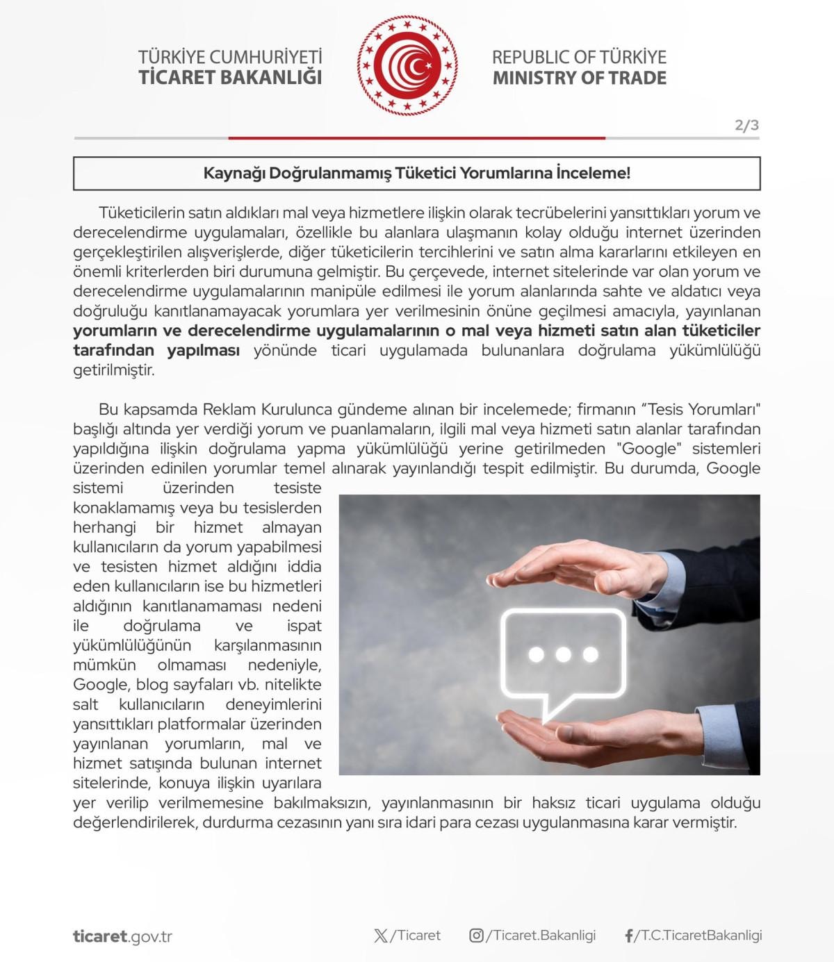 Ticaret Bakanlığı'nın açıklamalarına göre, tüketicilerin satın aldıkları mal veya hizmetlere ilişkin olarak tecrübelerini yansıttıkları yorum ve derecelendirme uygulamaları, özellikle bu alanlara ulaşmanın kolay olduğu internet üzerinden gerçekleştirilen alışverişlerde, diğer tüketicilerin tercihlerini ve satın alma kararlarını etkileyen en önemli kriterlerden biri durumuna geldi.