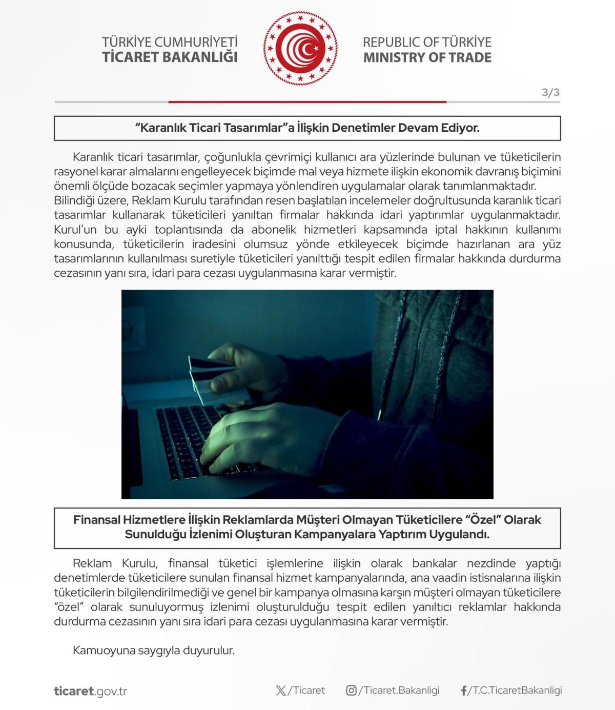 Ticaret Bakanlığı açıklamasında, karanlık ticari tasarımlara ilgili şu ifadeleri kullandı: