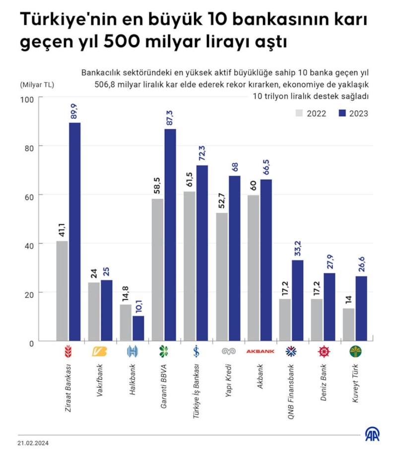 Böylece Türkiye'nin en büyük 10 bankası, 2023'te 506,8 milyar lira net dönem kârı elde etti ve ilgili bankaların toplam kârı önceki yıla kıyasla yüzde 40,4 artış göstermiş oldu.