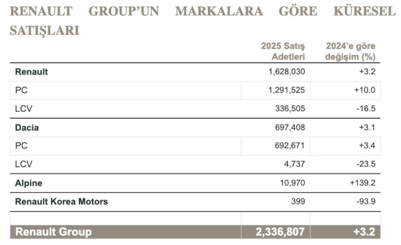 Renault Group, 2025’te elektrifikasyon ve dengeli ticari stratejisinin etkisiyle dünya genelinde satışlarını yüzde 3,2 artırarak 2,3 milyon adedin üzerine taşıdı.