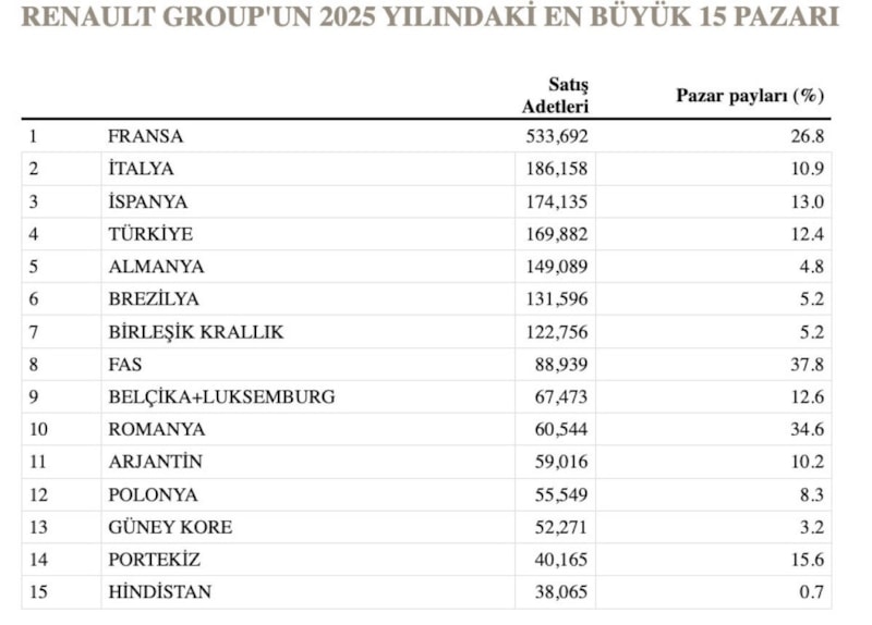 Avrupa dışı pazarlarda Renault markası yüzde 11,7 büyüdü. Latin Amerika, Güney Kore ve Fas’taki güçlü artışlar, Grubun küresel satış performansını destekledi. Bu sonuçla Renault, dünyanın en çok satan Fransız otomobil markası olma unvanını korudu.