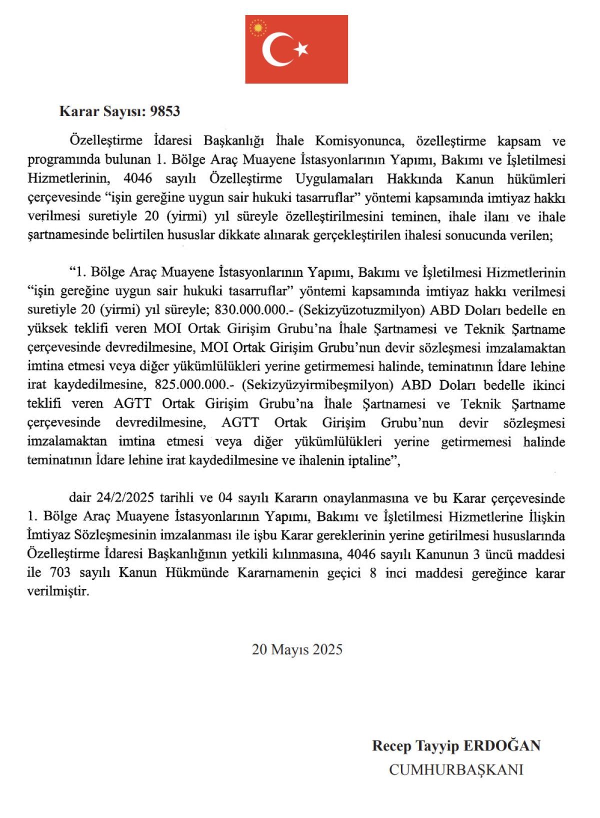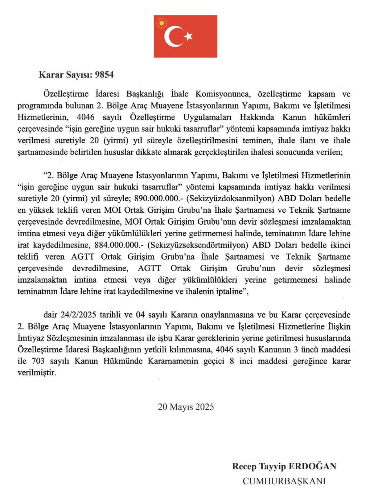 Resmi Gazete'de yayımlanan karara göre, araç muayene birinci ve ikinci bölge hizmetleri imtiyaz hakkının yapılan ihale sonucunda, 20 yıl süreyle ve toplam 1,72 milyar TL bedelle MOI Ortak Girişim Grubu'na devri onaylandı.