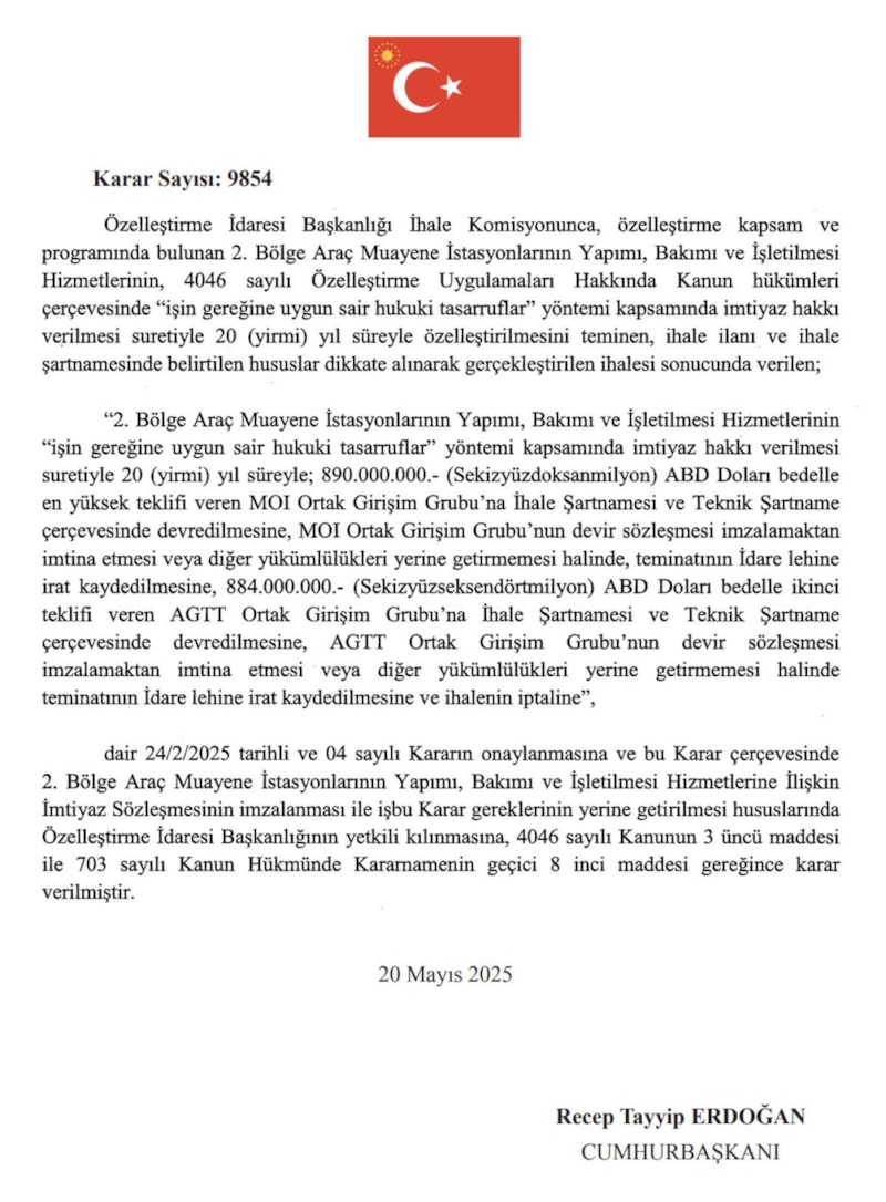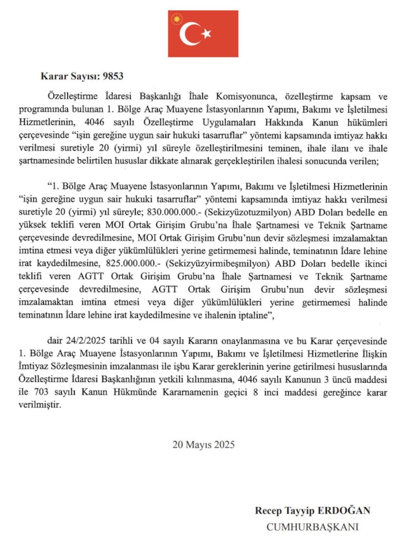 Resmi Gazete'de yayımlanan karara göre, araç muayene birinci ve ikinci bölge hizmetleri imtiyaz hakkının yapılan ihale sonucunda, 20 yıl süreyle ve toplam 1,72 milyar TL bedelle MOI Ortak Girişim Grubu'na devri onaylandı.