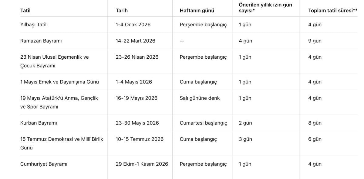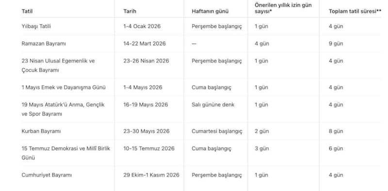 2026'DAKİ RESMİ TATİL TAKVİMİ NASIL?