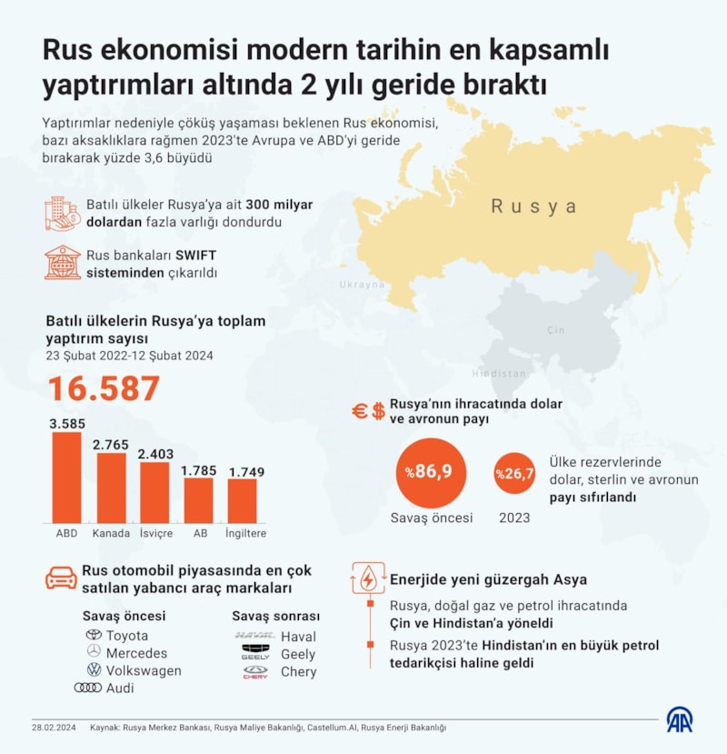 Batılı yetkililere ve çok sayıda uzmana göre ekonomik anlamda bir çöküş yaşaması beklenen Rus ekonomisi ise beklentilerin aksine, bazı aksaklıklara rağmen 2023'te Avrupa ve ABD'yi geride bırakarak yüzde 3,6 büyüme gerçekleştirdi.
