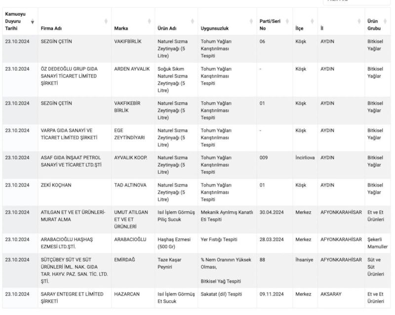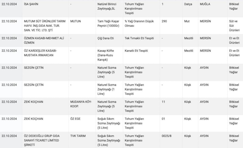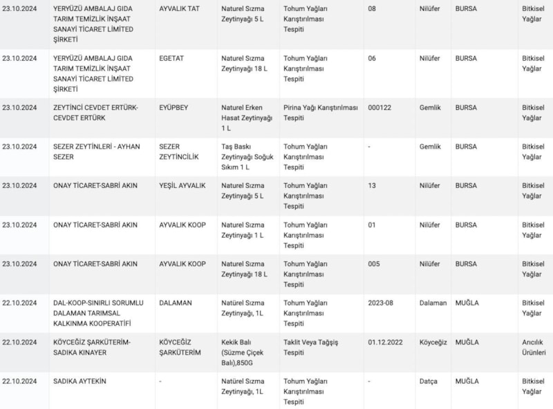 Taklit veya Tağşiş Yapılan Gıdalar listesine de 22 Ekim'de yeni 12 ve 23 Ekim'de 17 firma katıldı ve bu listedeki toplam sayı 694'e çıktı.