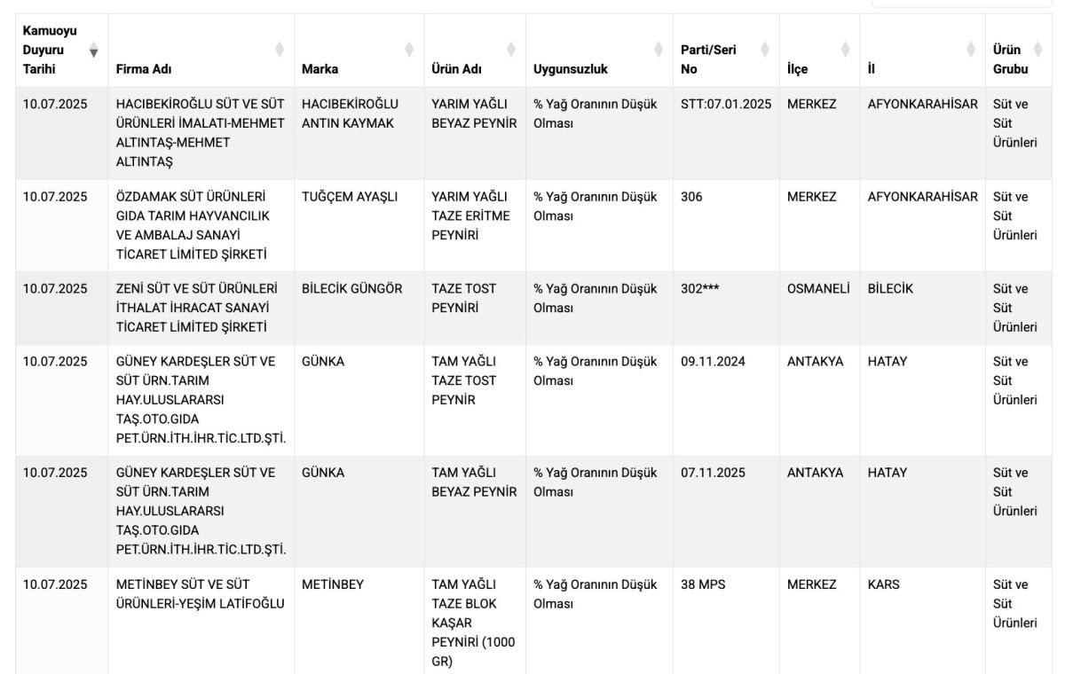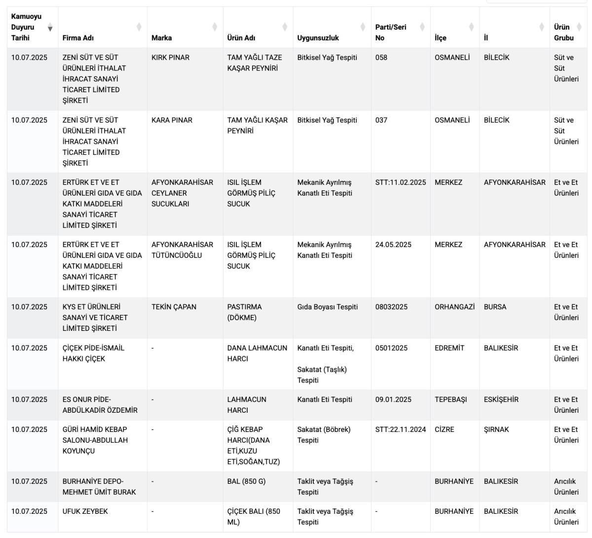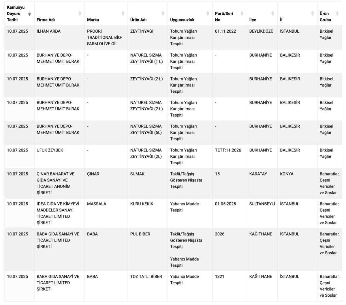 Son yapılan 10 Temmuz tarihli listede, sağlığı tehlikeye atacak şekilde tağşiş-taklit yapılan bitkisel ürün, baharat, peynir, şarküteri, bal ve zeytinyağı markaları ifşa edildi.