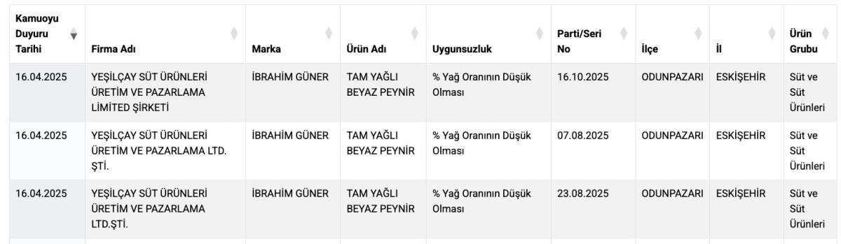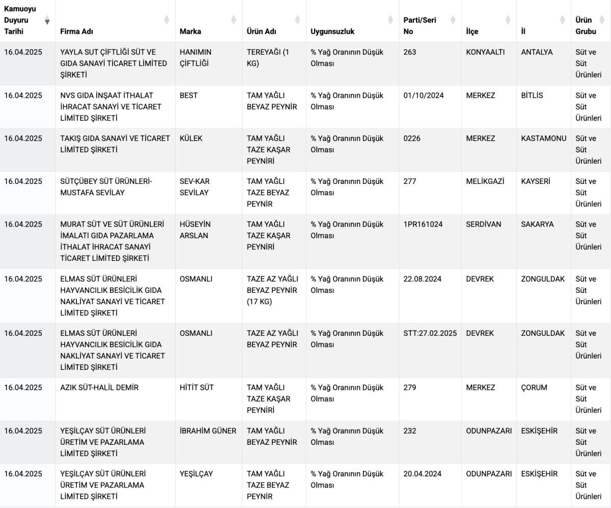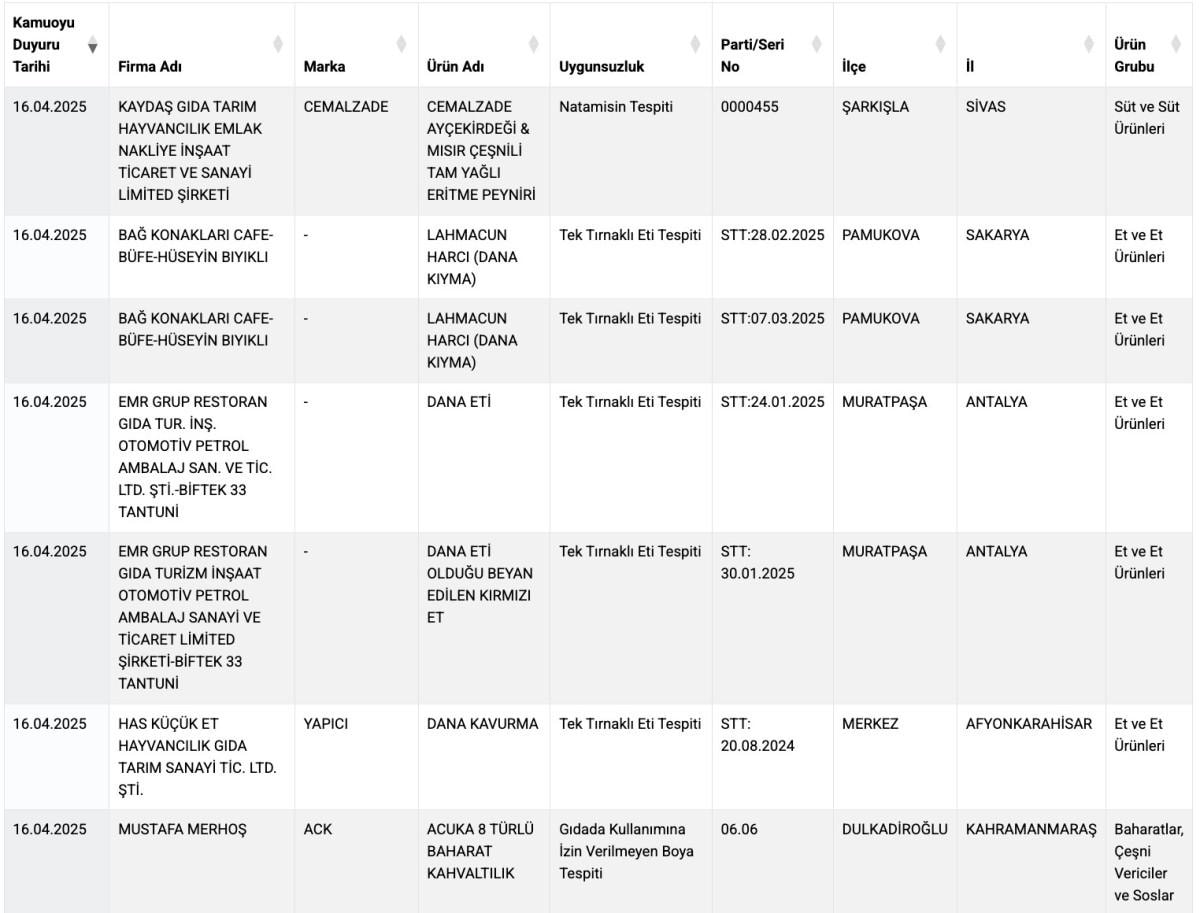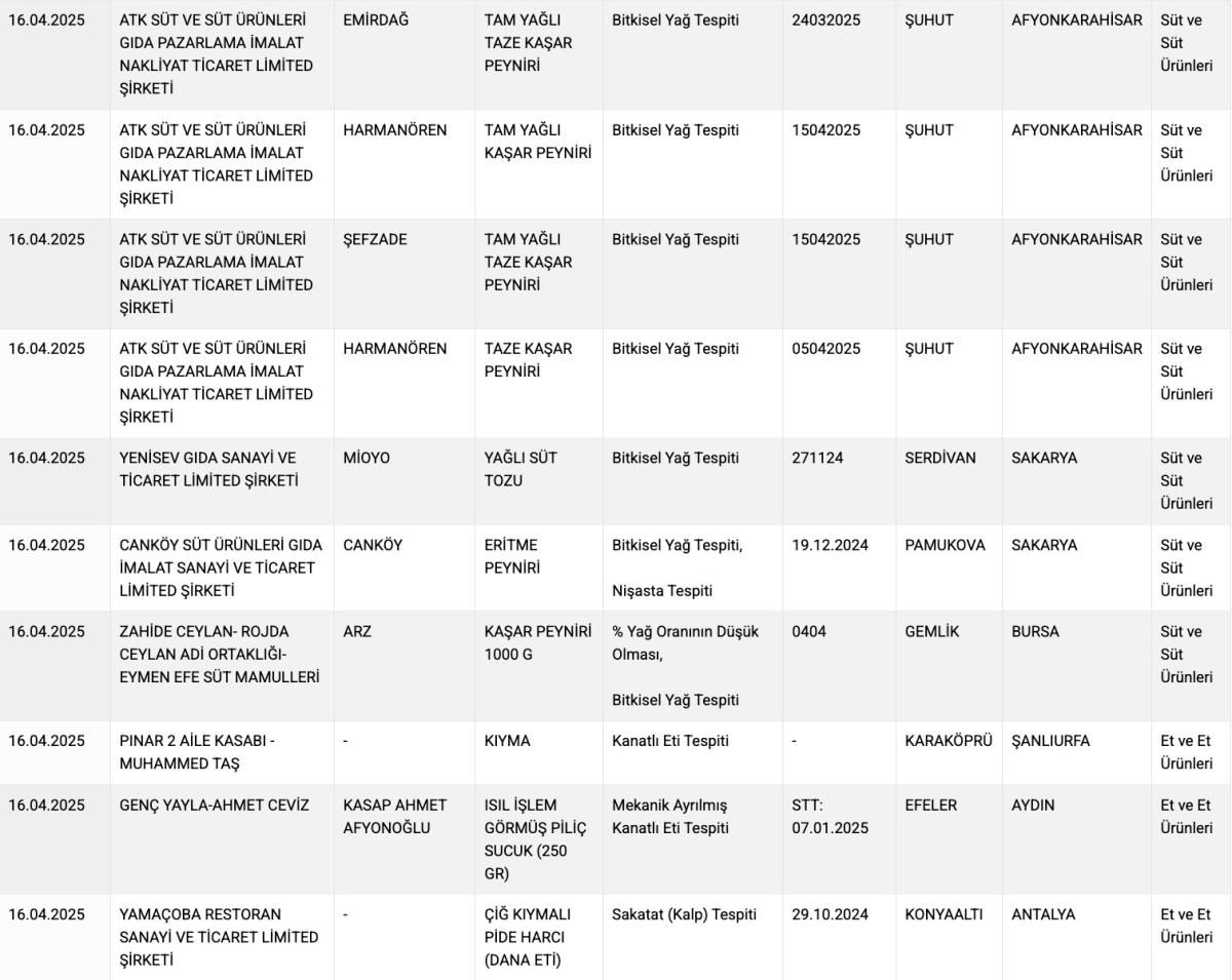 Aynı değeri taşımayan madde eklenmesi ile belirlenen "Taklit veya Tağşiş Yapılan Gıdalar" listesine, 16 Nisan'da 24 yeni firma eklendi. Böylece buradaki listede 1.157 kayıt oluşmuş oldu.