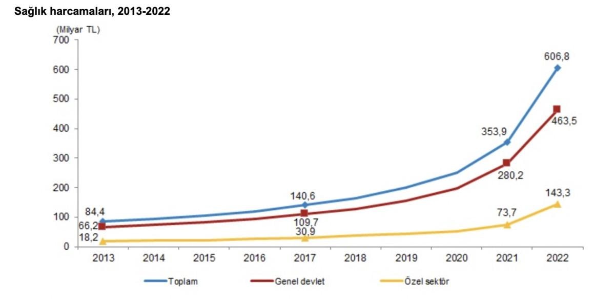 Toplam sağlık harcaması 2022 yılında, bir önceki yıla göre yüzde 71,5 artarak 606 milyar 835 milyon TL'ye yükseldi.