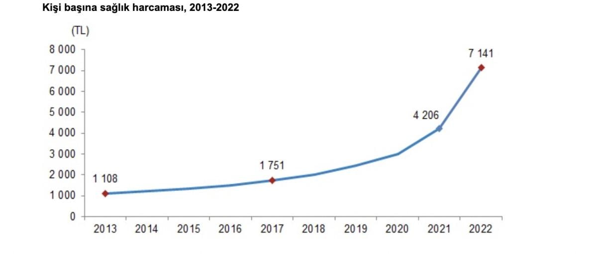 Kişi başına sağlık harcaması 2021 yılında 4 bin 206 TL iken, 2022 yılında yüzde 69,8 artarak 7 bin 141 TL'ye yükseldi.