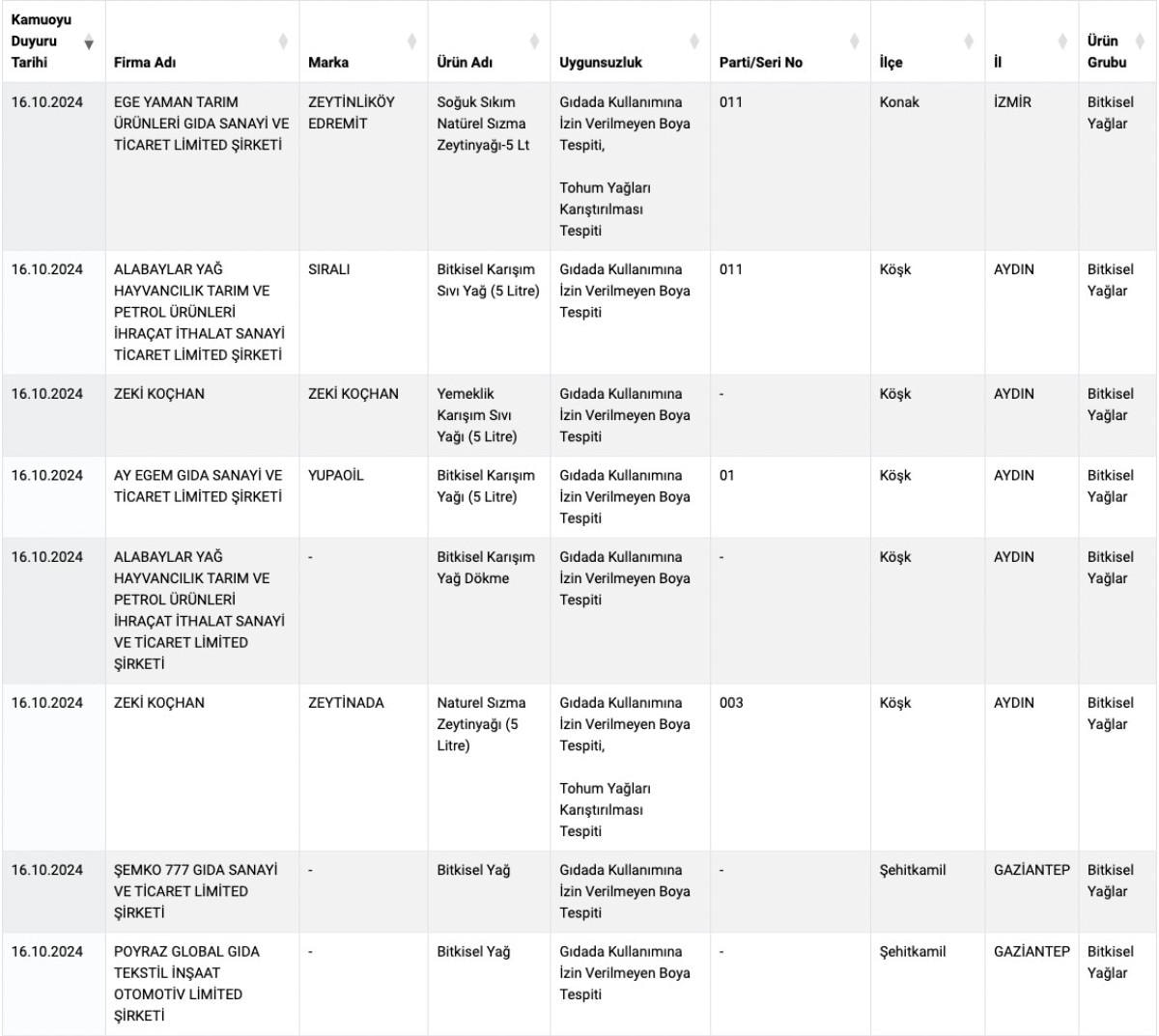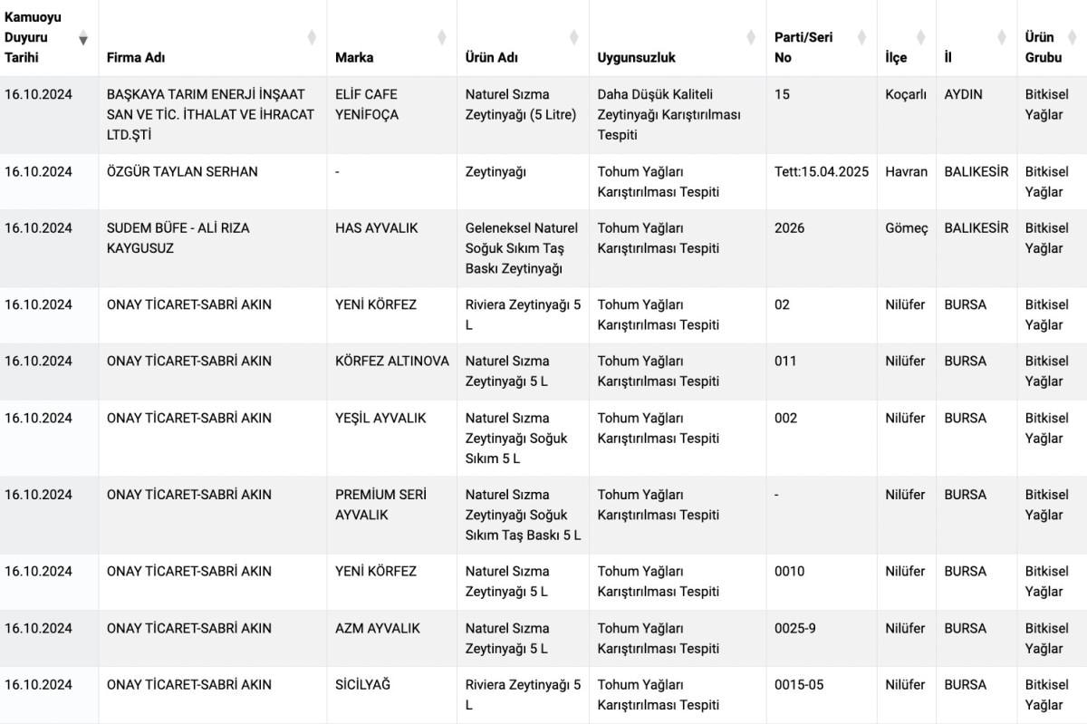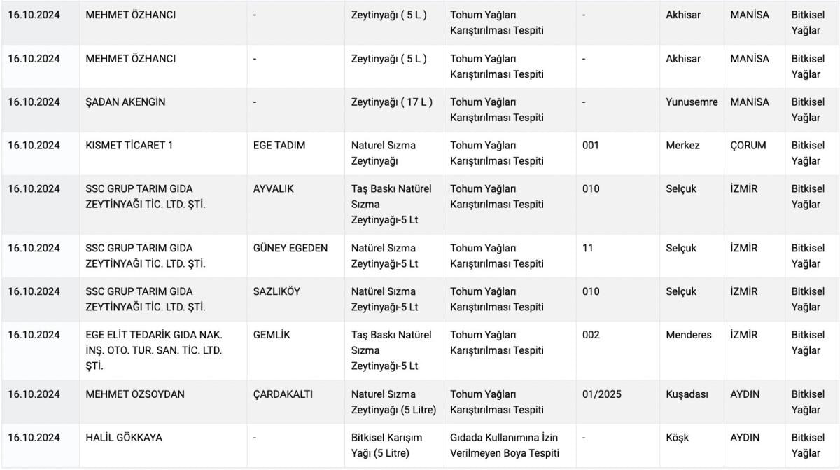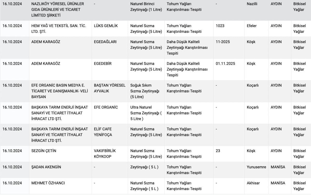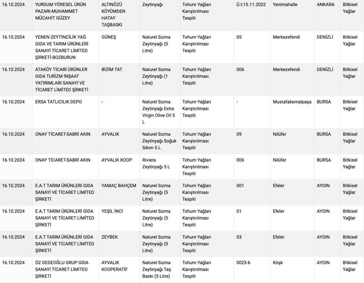 Listeye yeni katılan firmalar, zeytinyağına tohum yağları karıştırdı. Bu firmalar Balıkesir ve Bursa'da tespit edildi.