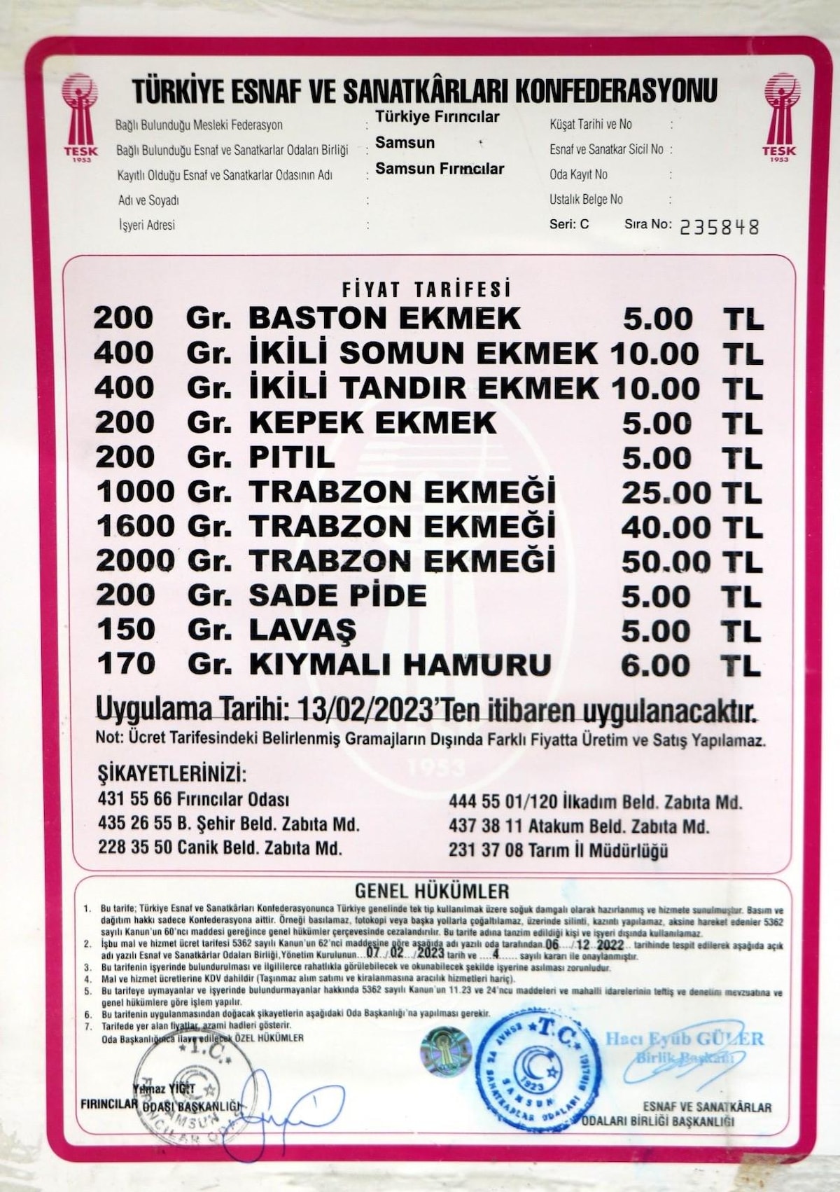 Yeni fiyat tarifesi ile birlikte 200 gr. baston ekmek 5 TL, ikili somon ekmek (400 gr.) 10 TL, ikili tandır ekmek (400 gr.) 10 TL, kepek ekmek (200 gr.) 5 TL, pıtıl (200 gr.) 5 TL, Karadeniz ekmeği (2 kilo) 50 TL, sade pide (200 gr.) 5TL, lavaş (150 gr.) 5 TL ve kıymalı hamuru (170 gr.) 6 TL'den satılacak.
