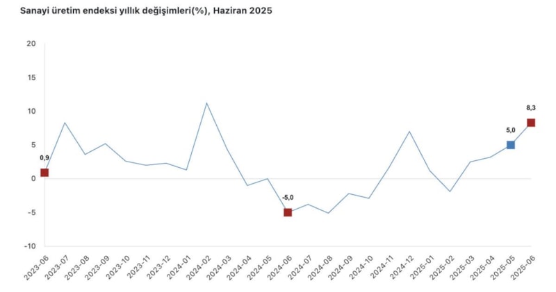 Sanayi üretim endeksi haziranda, aylık bazda yüzde 0,7, yıllık bazda yüzde 8,3 artış gösterdi. Böylece, Türkiye, sanayi üretiminde son 16 ayın zirvesine ulaştı.