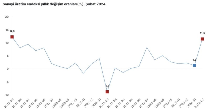 TÜİK, şubat ayına yönelik sanayi üretimi verisini paylaştı. Buna göre, Türkiye'de sanayi üretim endeksi şubatta aylık bazda yüzde 3,2, yıllık bazda yüzde 11,5 yükseldi.