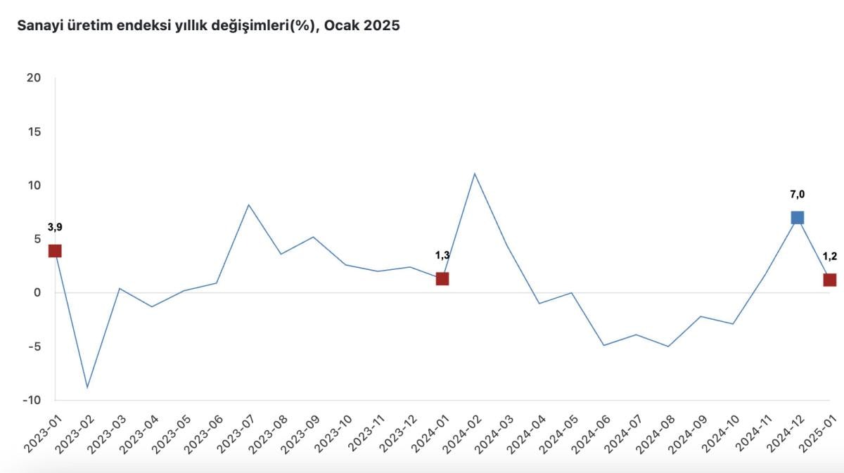 Sanayinin alt sektörleri incelendiğinde, 2025 yılı Ocak ayında madencilik ve taş ocakçılığı sektörü endeksi, bir önceki aya göre yüzde 7,5 arttı, imalat sanayi sektörü endeksi yüzde 3 azaldı ve elektrik, gaz, buhar ve iklimlendirme üretimi ve dağıtımı sektörü endeksi yüzde 0,8 azaldı.